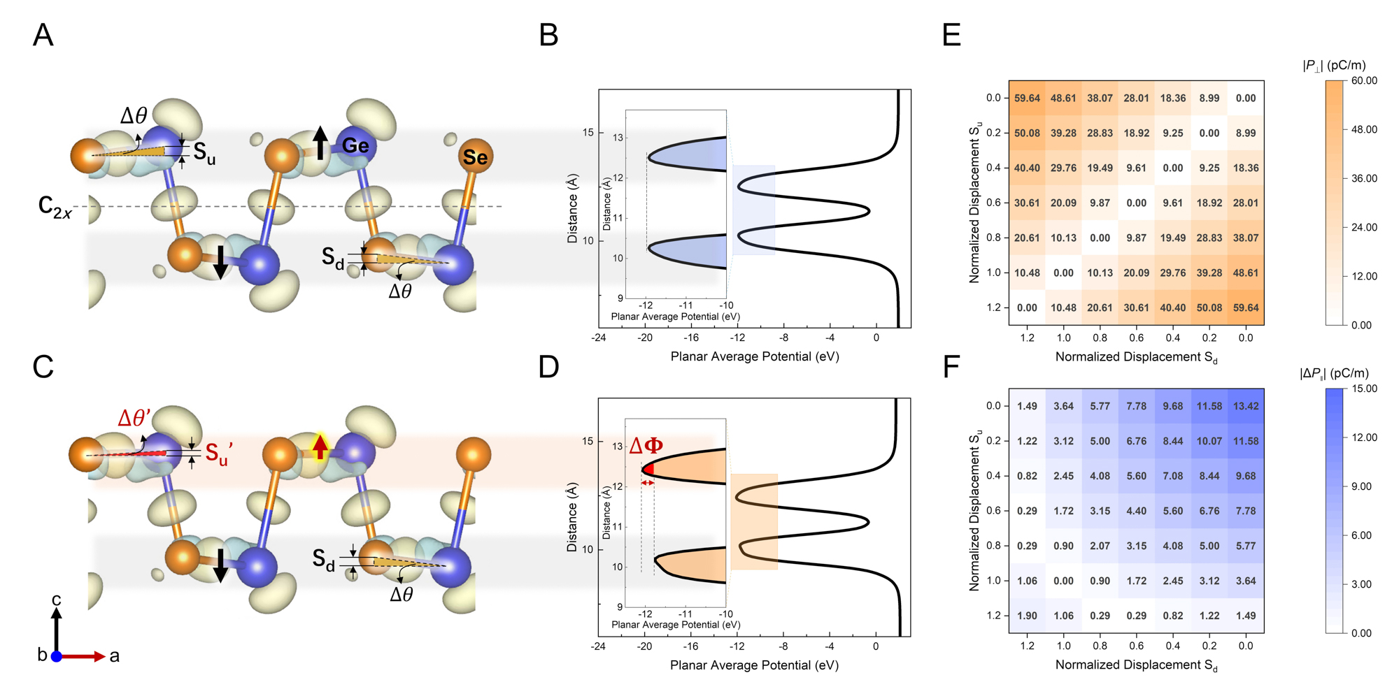 图1. 第一性原理计算区分初始和 Janus GeSe。(A-B)初始 GeSe 的晶体结构和能量图。(C-D)Janus GeSe 的晶体结构和能量图。(E-F)Janus GeSe 的面内面外极化强度分布图。