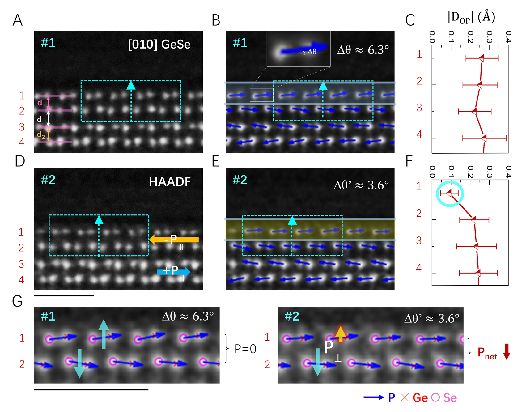 研究人员利用 STEM 分析揭示 Janus GeSe 原子结构。通过观察对比 GeSe 原始 Pnma 以及诱导的 Janus 晶体结构表面层 STEM-HAADF 图像(图3)发现,由于 Janus 结构表面层翘曲程度变小,使得第二层偶极子未能完全相互抵消,从而诱导出净面外极化;与此同时,面内反铁电性被打破,使 Janus GeSe 同时具备面内、面外极化矢量。