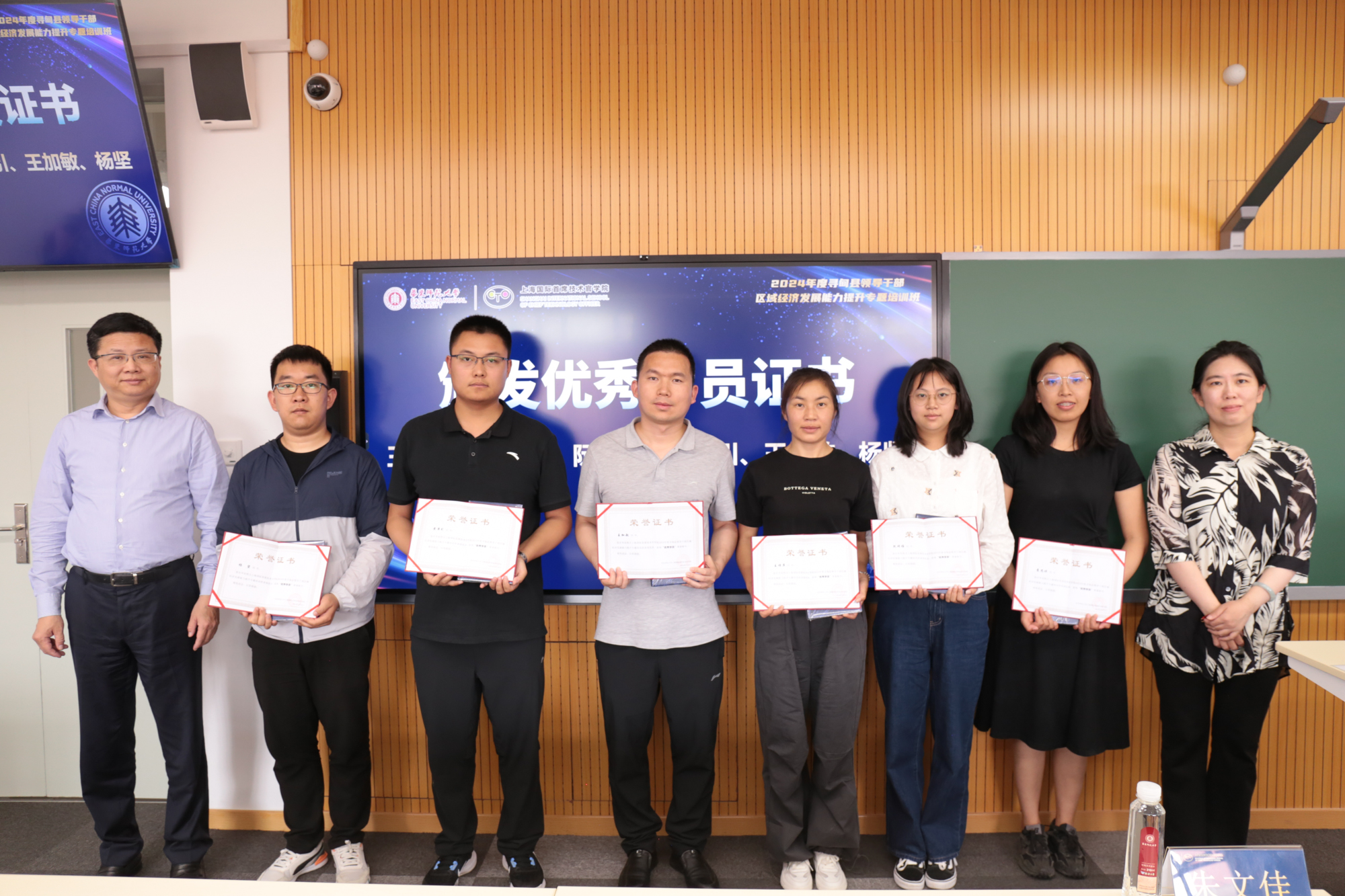 培训结业仪式由朱文佳主持,何佳讯作总结致辞。何佳讯与朱文佳为学员代表佩戴院徽,并颁发优秀学员证书。47位寻甸县政府干部正式获得华东师大上海国际首席技术官学院校友身份,将通过沪滇两地区域优势赋能,共建寻甸美好明天。