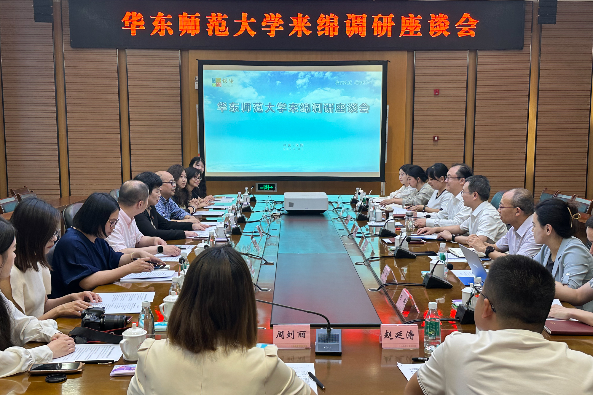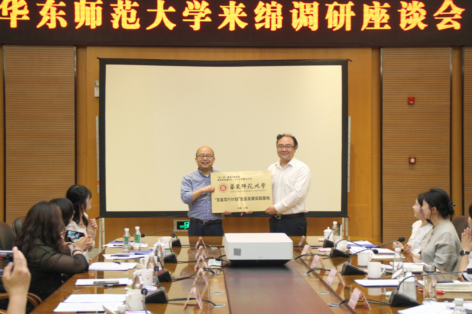 5月24日下午,调研组赴绵阳市开展调研。绵阳市委组织部副部长、市委人才办主任江保权,市委教育工委委员、市教体局党组成员、副局长张辅,市委组织部相关负责同志及华东师大在绵选调生代表等参加交流座谈会。与会人员就绵阳市的城市发展与人才政策,学校人才培养与输送情况等开展交流,共同探讨就业实习、实践基地项目等合作事宜。在绵阳市委组织部与华东师大双方代表的见证下,举行了“百县笃行计划”授牌仪式。
