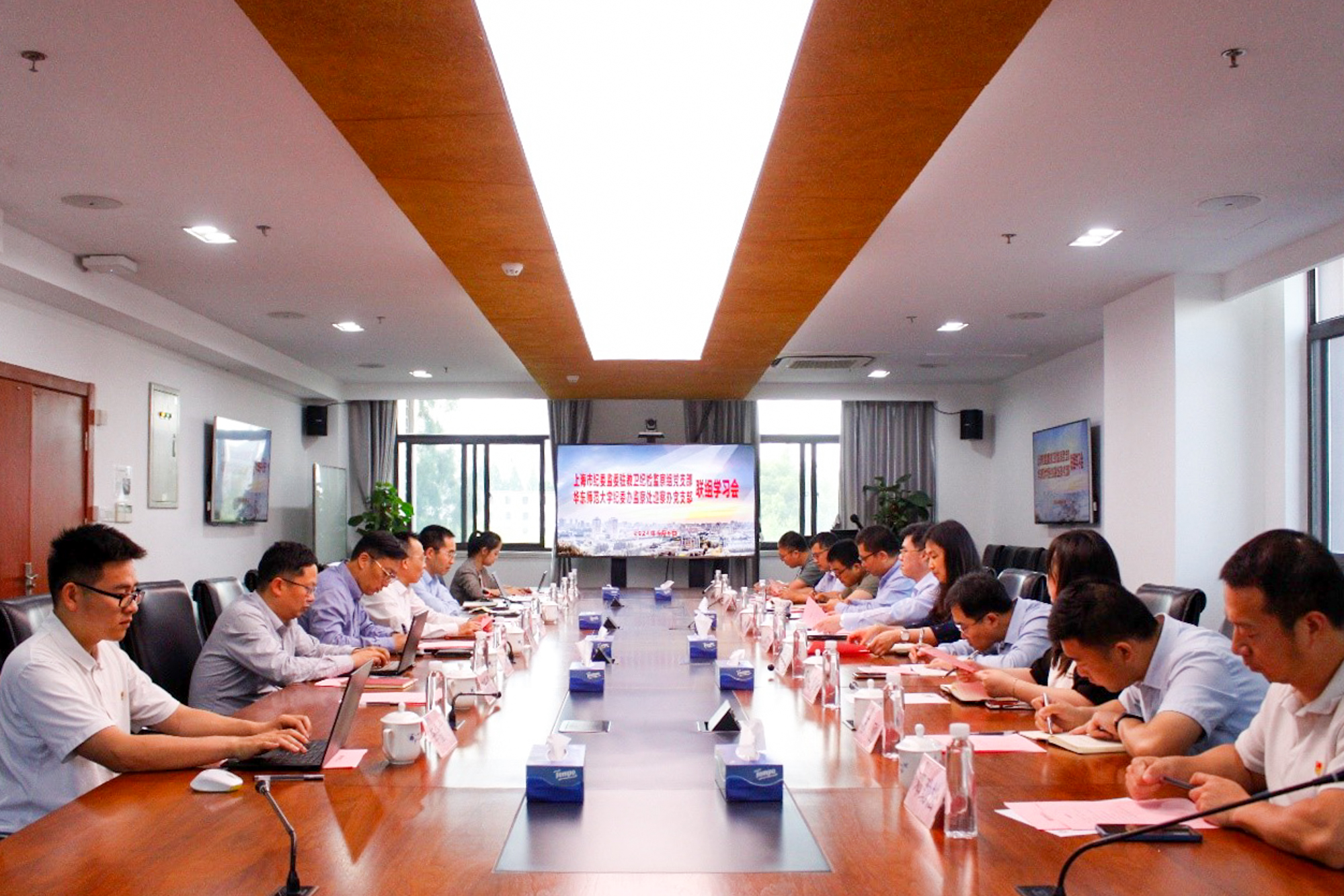 为推动党纪学习教育走深走实,加强纪检监察工作交流互动,上海市纪委监委驻市教卫工作党委纪检监察组党支部与3245澳门新莆京纪委办监察处巡察办党支部,于6月6日在华东师大普陀校区开展专题联组学习活动。市教卫工作党委委员、市纪委监委驻市教卫工作党委纪检监察组组长胡章萍出席。华东师大党委副书记、纪委书记曹友谊出席并主持联组学习。