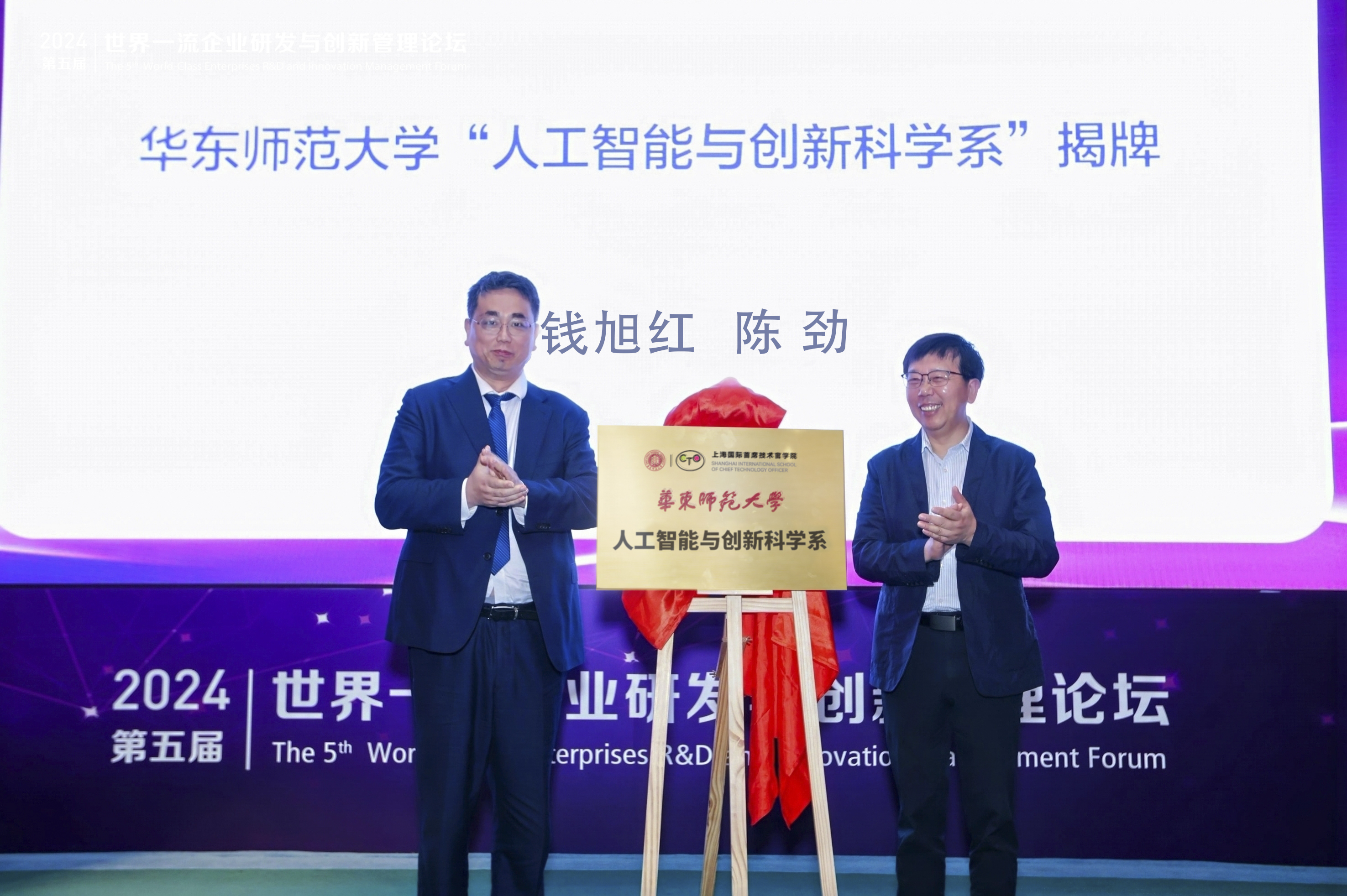 中国工程院院士、华东师大校长钱旭红,清华大学技术创新研究中心主任、上海国际首席技术官学院学术委员会主任陈劲为“人工智能与创新科学系”揭牌。