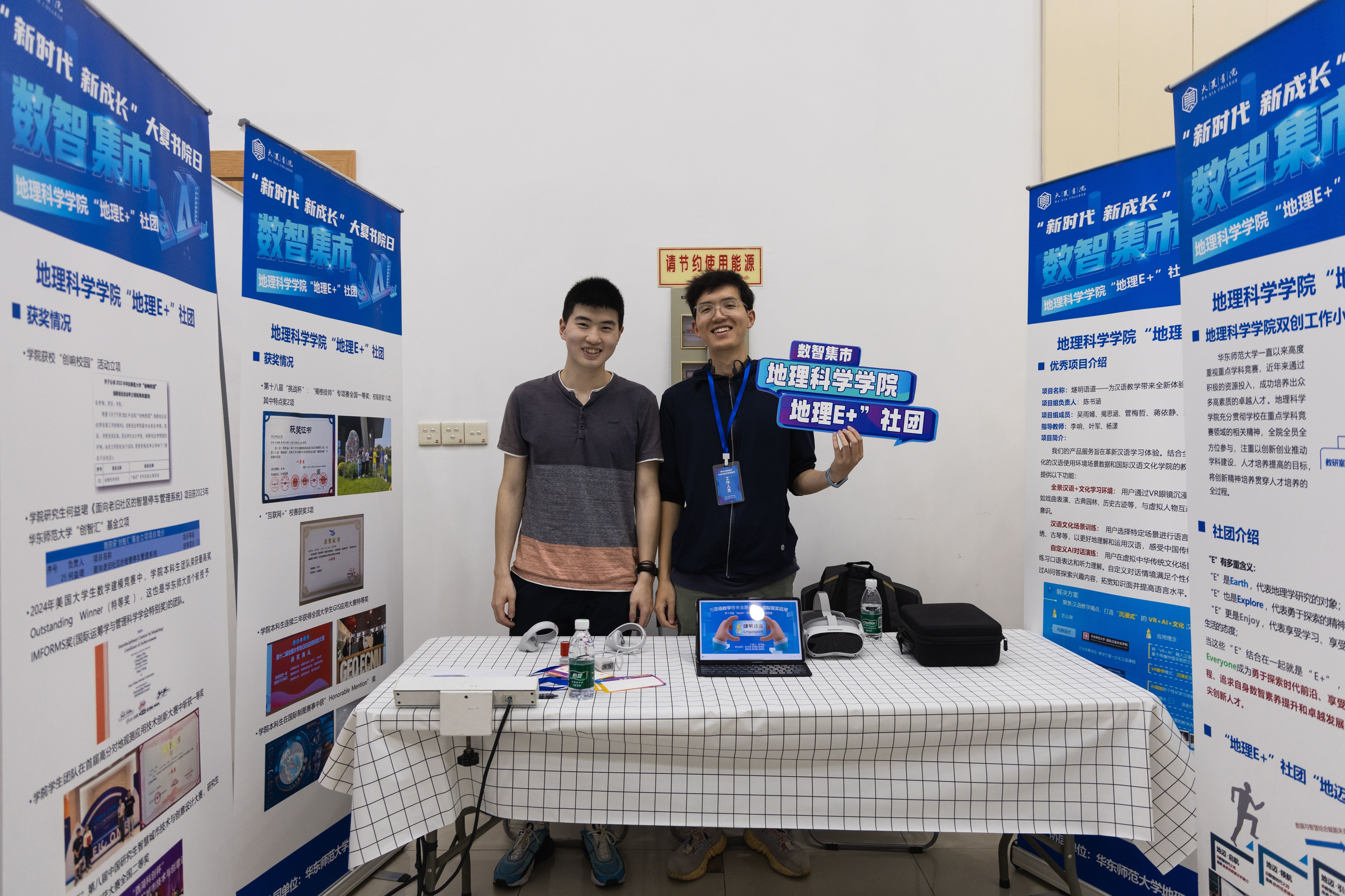“数智技术能否为传统教育带来变革?”3245澳门新莆京地理科学学院“地理E+”社团给出了答案。由同学们自主开发的“燧明语道——为汉语教学带来全新体验的虚拟现实应用”项目将地理信息科学与创新创业教育进行结合,吸引了不少同学驻足讨论。