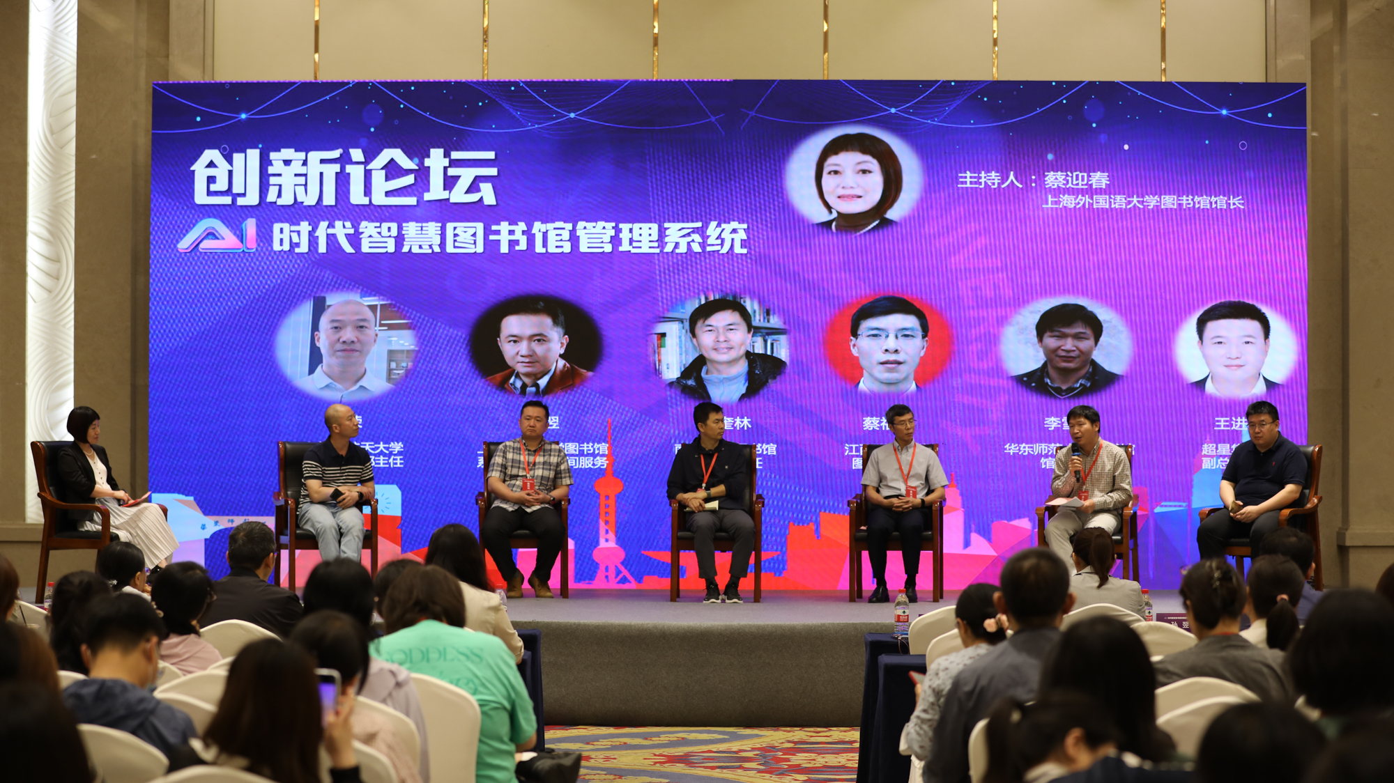 上海外国语大学图书馆馆长蔡迎春主持开放研讨环节。江西理工大学图书馆馆长蔡福瑞、上海交通大学图书馆系统技术与空间服务中心主任孙翌、南京大学图书馆技术部主任沈奎林、南京航空航天大学图书馆技术部主任汪荣、3245澳门新莆京图书馆馆长助理李雪锋、超星集团南京研究院院长王进共同探讨了AI时代智慧图书馆管理系统创新相关话题。
