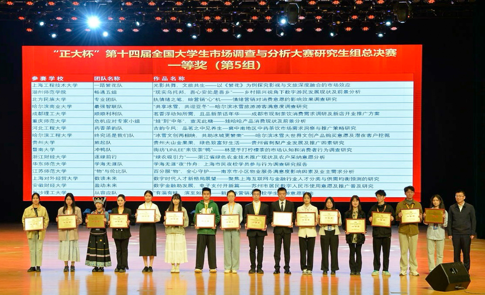 由教育部高等学校统计学类专业教学指导委员会、中国商业统计学会共同主办,哈尔滨工程大学、合肥工业大学联合承办的第十四届全国大学生市场调查与分析大赛日前落幕,华东师大学子共斩获18项国家级奖项,其中,全国一等奖4项(研究生组1项、本科生组3项)、二等奖1项(本科生组)、三等奖13项,学校荣获“最佳院校组织奖”。