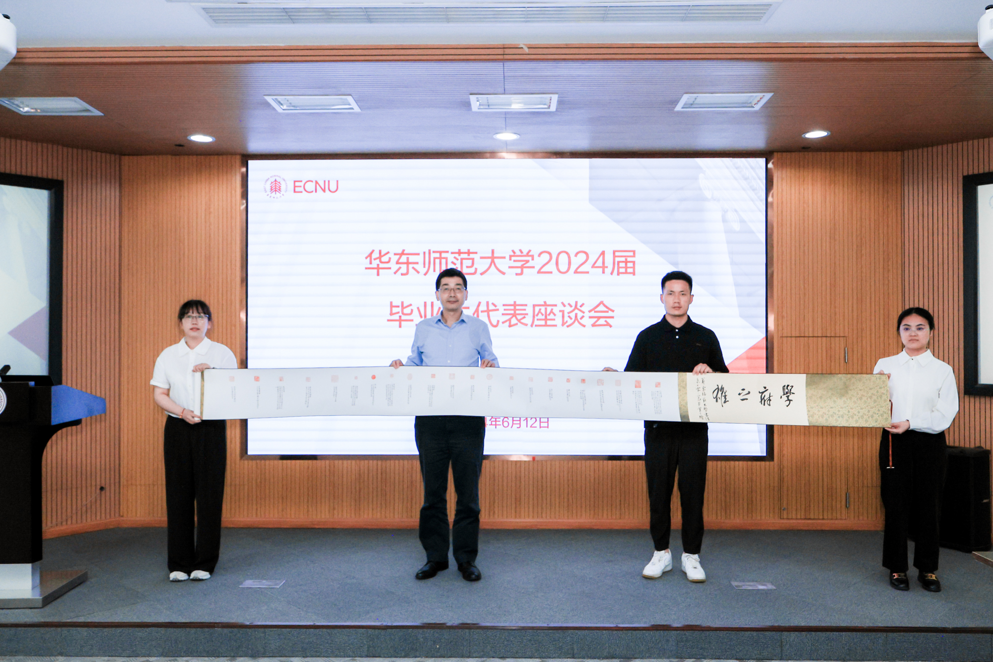座谈会上,毕业生代表们深情分享了师大求学历程中的感悟与收获,师大学子立志在今后的学习工作中继续追求卓越,并对母校未来的建设和发展提供了一些中肯的意见建议。本科生唐艺馨在学期间,“追求卓越”一直是她对自己的要求。她曾组织百余名志愿者开设400余堂特色课程,还曾参加21项各类竞赛,实习期间共发稿80余篇,累计阅读量超55万;博士生徐恒回顾了自身在校期间投身学术、科技报国的经历,分享了自身积极服务社会、履践致远的理念。其研究成果被材料领域顶刊发表,还曾参与央视反诈宣传专题报道;民族学生赛菲娜·沙塔尔从在校期间参加的社会实践及志愿活动、民族学生工作经历向大家分享。她积极参加线上陪读公益活动、民族学生骨干训练营君远班,展示优秀师大学子的精神风貌;魏喇妲以留学生的视角回顾她在师大学习生活中感受到的温暖与关怀。其导师不仅给予她很多学业上的指导,更帮助她和同学们建立更密切的关系,感谢师大为她提供了实现梦想的平台。