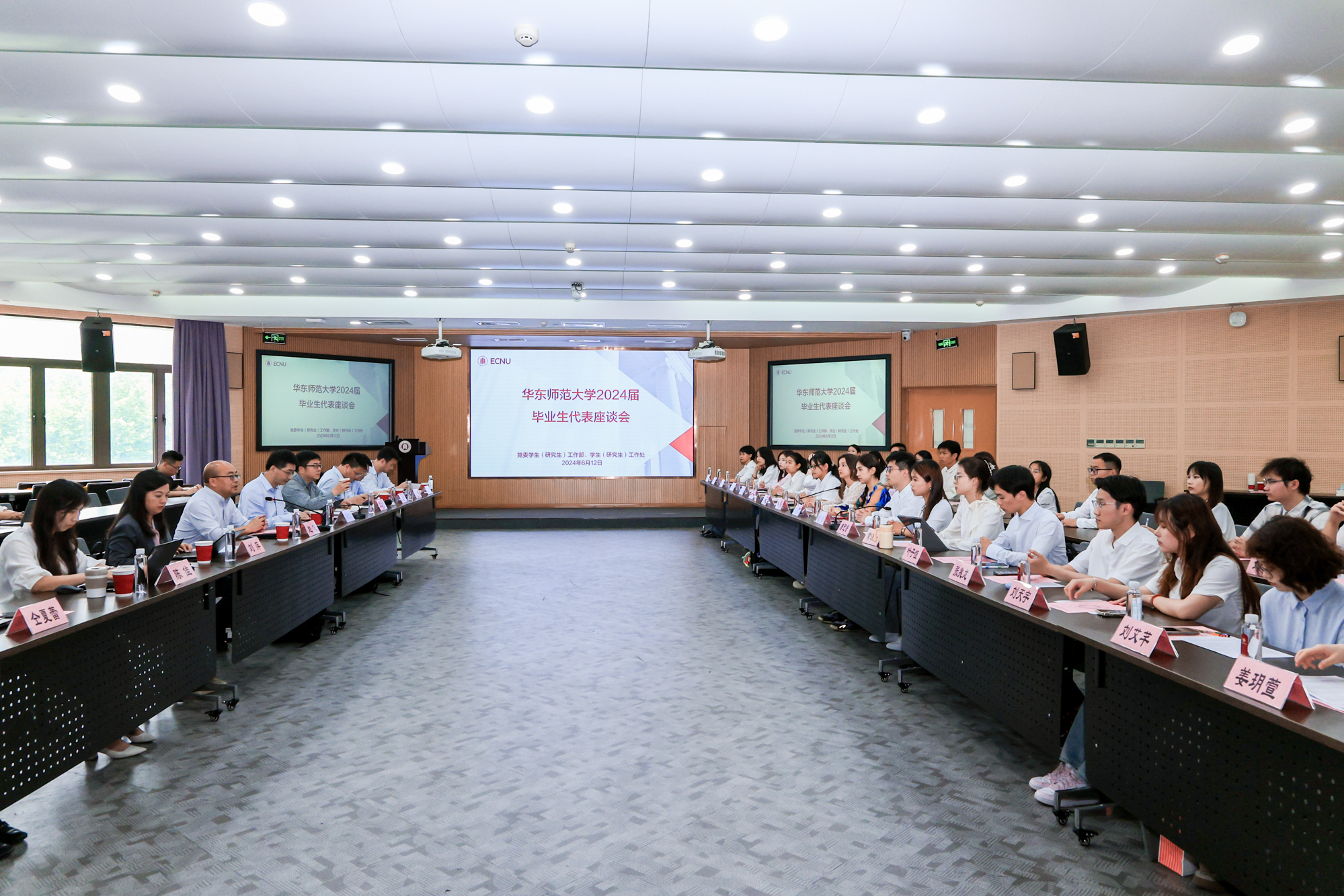 为持续推进卓越育人,进一步做好毕业生教育工作,表彰优秀学生、激励在校学生,及时总结育人经验,6月12日下午,2024届毕业生代表座谈会在普陀校区举行。校党委副书记、副校长顾红亮与来自各单位的34名本硕博毕业生代表亲切交流,了解同学们在师大的成长故事,听取同学们对母校的发展建议。座谈会由党委学生(研究生)工作部部长,学生(研究生)工作处处长赵健主持。党委统战部、教务处、研究生院、招生办公室、后勤保障部、校友工作办公室、国际教育中心等部门的有关负责人参加了座谈会。