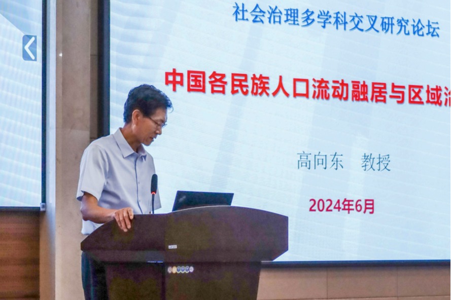 上午场报告由华东师大心理与认知科学学院副教授、纪检监察研究院廉政心理研究中心副主任胡杨主持。华东师大中国现代城市研究中心、人口研究所高向东教授作题为《中国各民族人口流动融居与区域治理研究》的重点报告。报告指出,人口的大规模流动是改革开放以来我国社会变迁的重要变化之一,各民族在社会生活中紧密联系的广度和深度也前所未有。社会要顺应时代要求,创造各族群众共居共学、共建共享、共事共乐的社会结构和社会条件,逐步实现各民族在空间、文化、经济、社会、心理等方面的全方位嵌入。