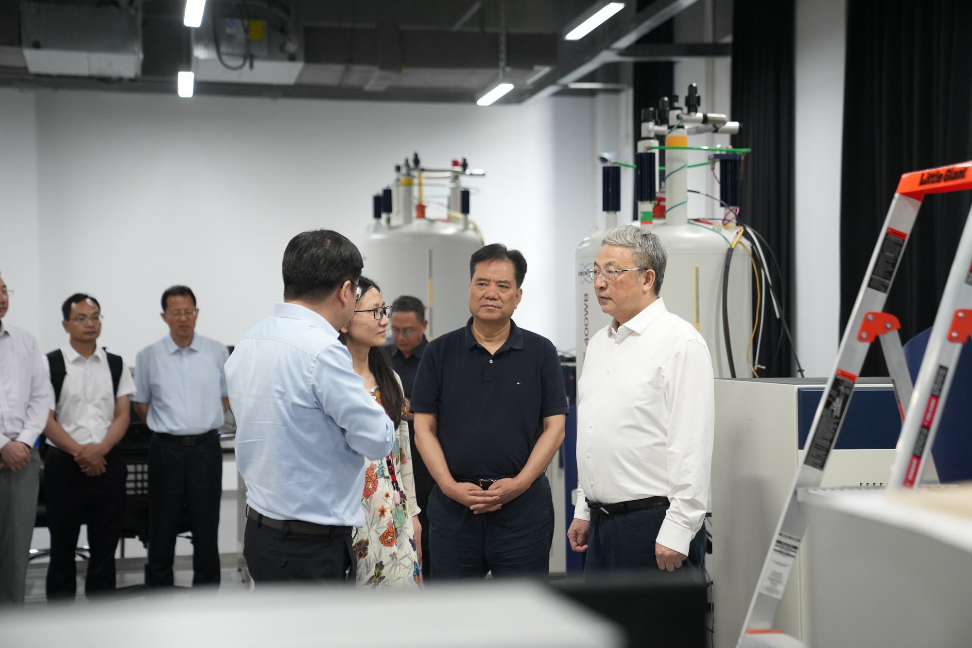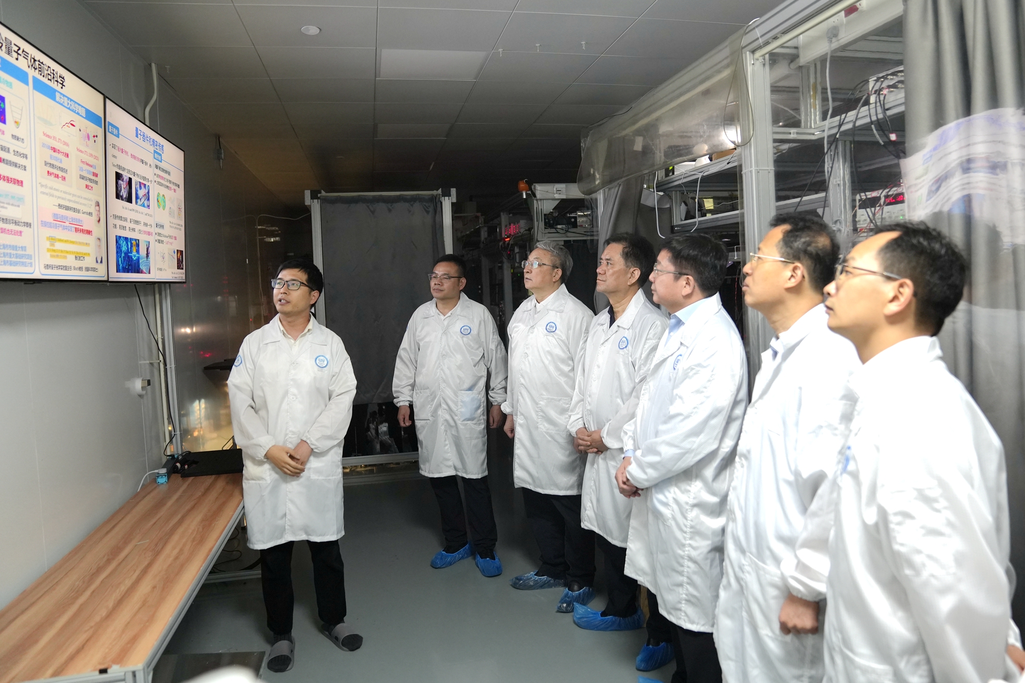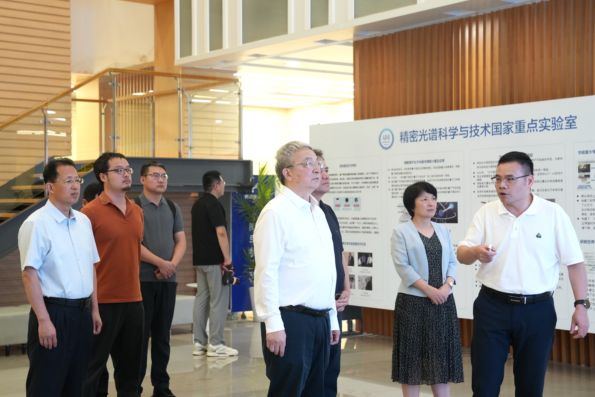 王光谦一行首先来到华东师大精密光谱科学与技术国家重点实验室,调研光钟、量子计算和模拟,以及磁共振等关键核心技术的科研进展,详细了解实验室不断挑战时间、空间和频率等基本物理量现有精度极限,开展的精密光谱基础研究探索与重大科技攻关。