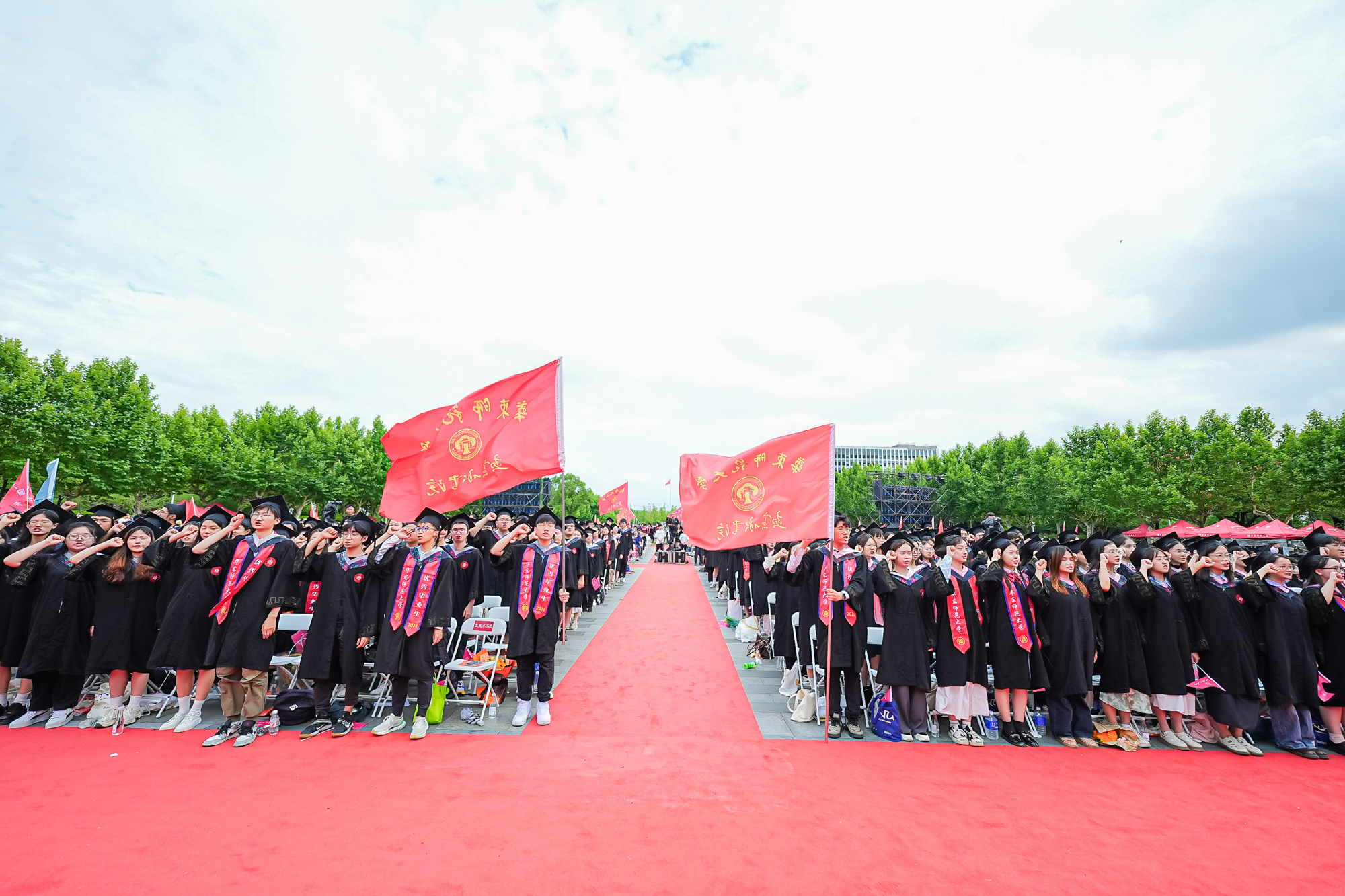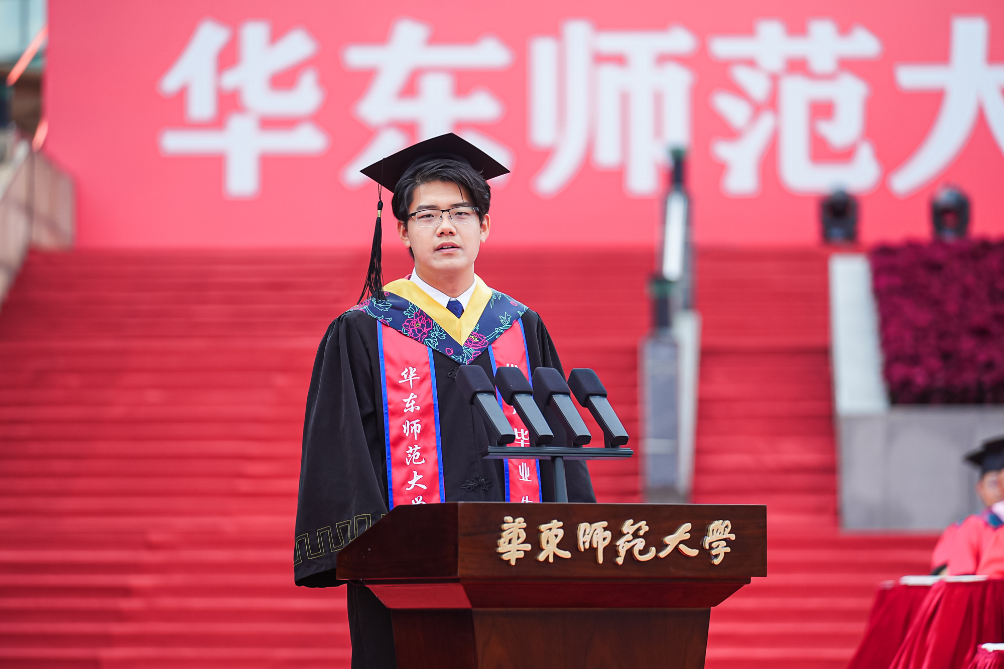 毕业生出征仪式上,直博北京大学的本科生邱博然、将赴江西基层服务社会的硕士生李青竹、投身于科研的博士生孔德强、将赴西部支教的本科生刘婧妤、科技创业的硕士生马圣进、将去上海南洋中学任教的硕士生纪晨毓等六位毕业生,以铿锵有力的朗诵展示了华东师大毕业生踔厉奋发、砥砺前行的风采。