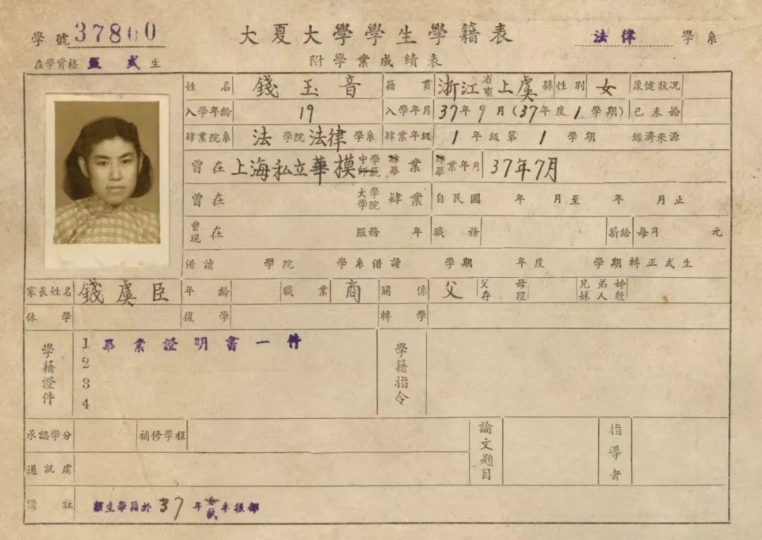 钱玉音、査汝勤的大夏大学学生学籍卡