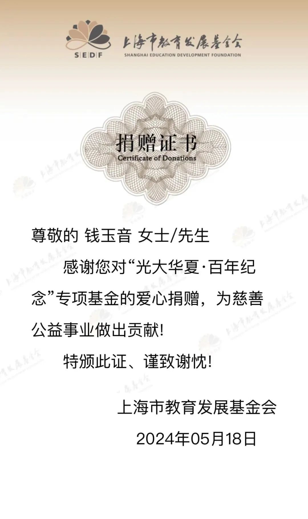 经查询得知,这笔捐款来自96岁高龄的大夏大学校友钱玉音,她嘱托儿子——华东师大中文系1979级査建渝校友捐赠。