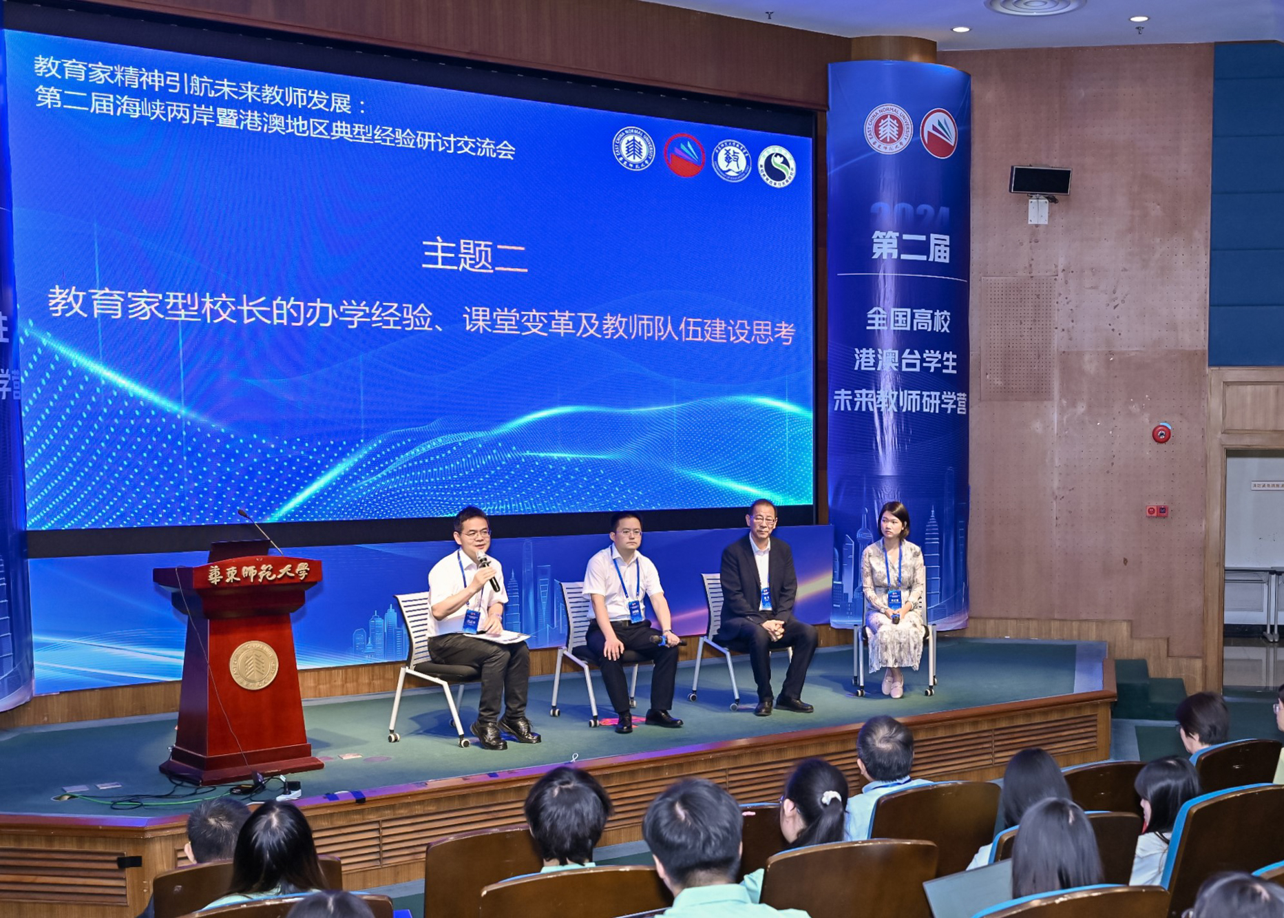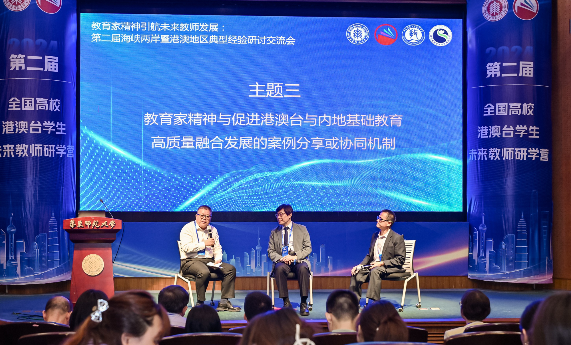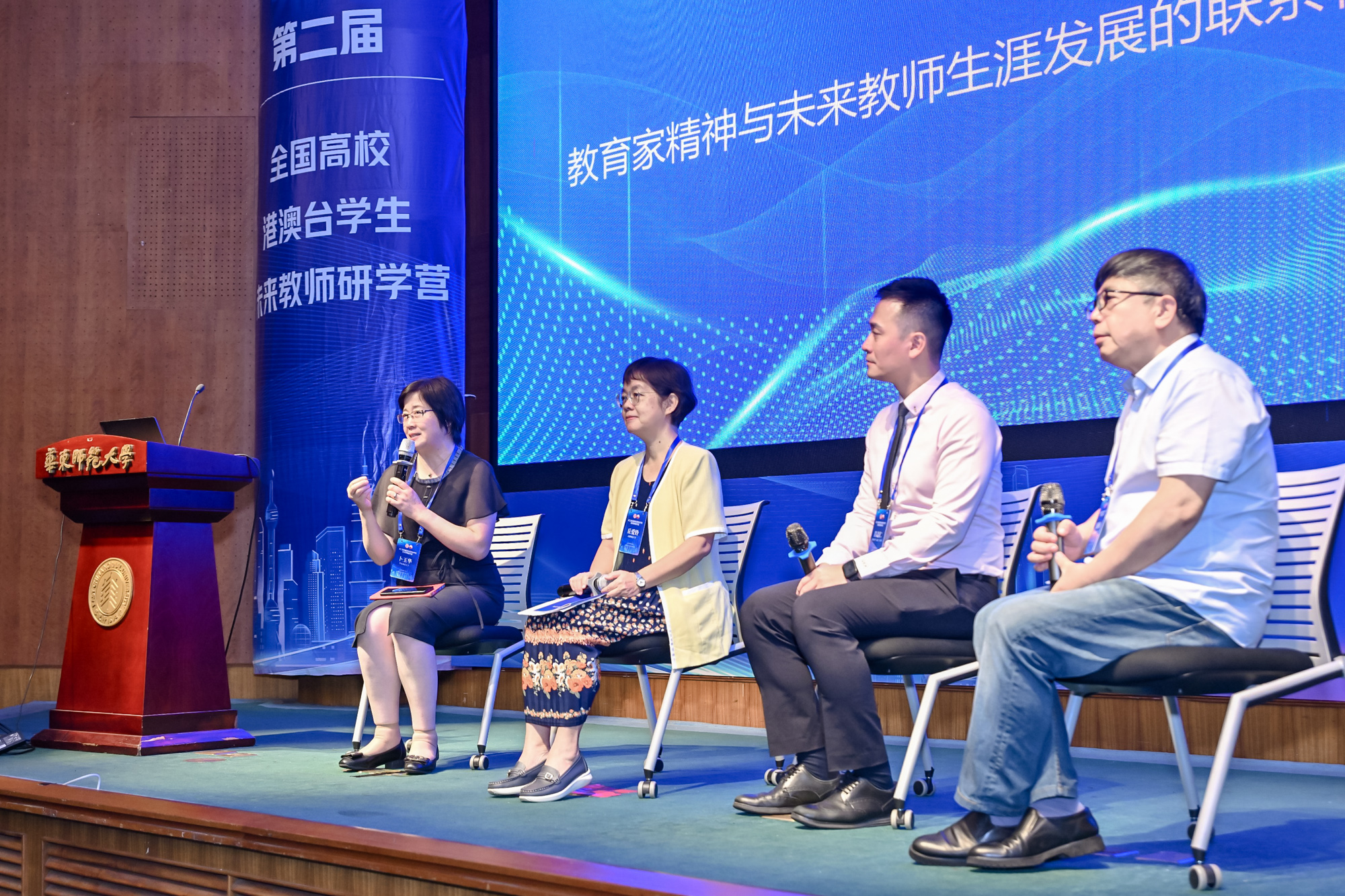 3245澳门新莆京党委常委、学校办公室主任张惠虹出席开营仪式并致辞。上海市人民政府港澳事务办公室港澳处处长陈智辉、市教委港澳台办副主任陈皞、上海市台湾事务办公室海外处副处长樊晓、普陀海外联谊会副会长富彩萍出席。近30位来自北京师范大学、华中师范大学、西南大学、香港大学、台北教育大学等近10所院校的港澳台学生,10余位海峡两岸暨香港、澳门校长、教师齐聚3245澳门新莆京,热议教育家精神,交流教育理念,展示教学成果,共话教师发展。3245澳门新莆京孟宪承书院、港澳台办公室、教师教育学院、教务处、基终部、党委统战部、学工部等单位负责人或代表到会。开营仪式由港澳台办公室主任王素斌主持。