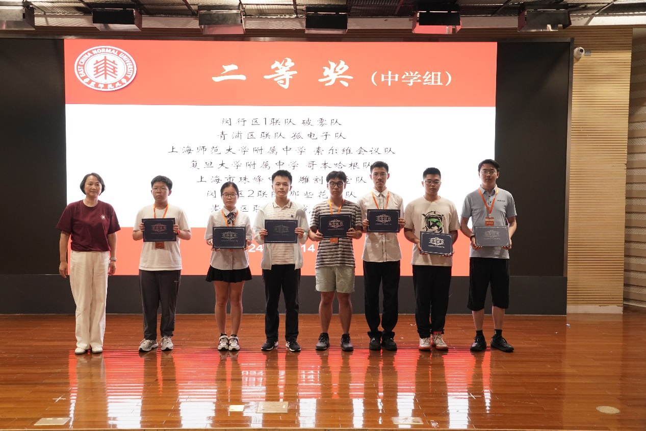 二等奖:闵行区1联队(破雾)、青浦区联队(孤电子队)、上海师范大学附属中学(索尔维会议队)、复旦大学附属中学(哥本哈根队)、上海市珠峰中学(雕刻时空)、闵行区2联队(那些花儿)、崇明区联队(主战坦克队)