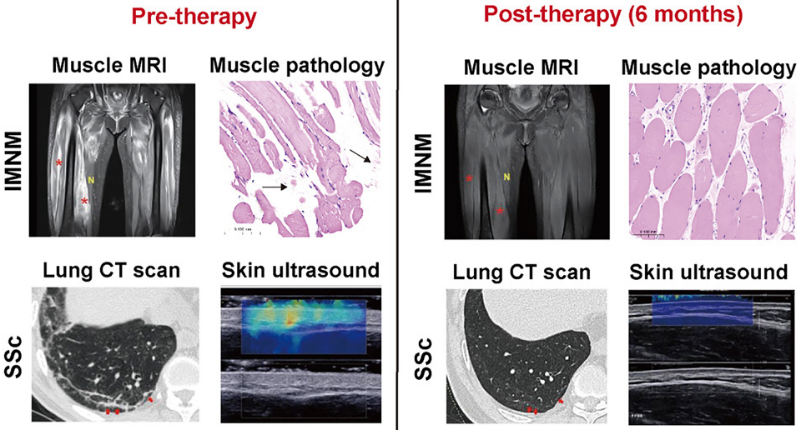 结果表明,靶向 CD19 的通用型 CAR-T 细胞在所有患者体内能够有效扩增和完全清除B淋巴细胞,3个月后实现B细胞的重塑。免疫介导的坏死性肌炎(IMNM)的患者肌力显著改善,核磁共振和病理显示肌肉炎症明显缓解,实验室检查肌酶从异常高水平降至正常上线,自身抗体完全清除。弥漫型系统性硬化症(SSc)患者的皮肤实现软化,皮肤活检证实炎症改善和新的附腺生成,CT 和核磁共振显现心肺等重要器官的纤维化实现损伤逆转,并在6个月的随访期间持续改善。