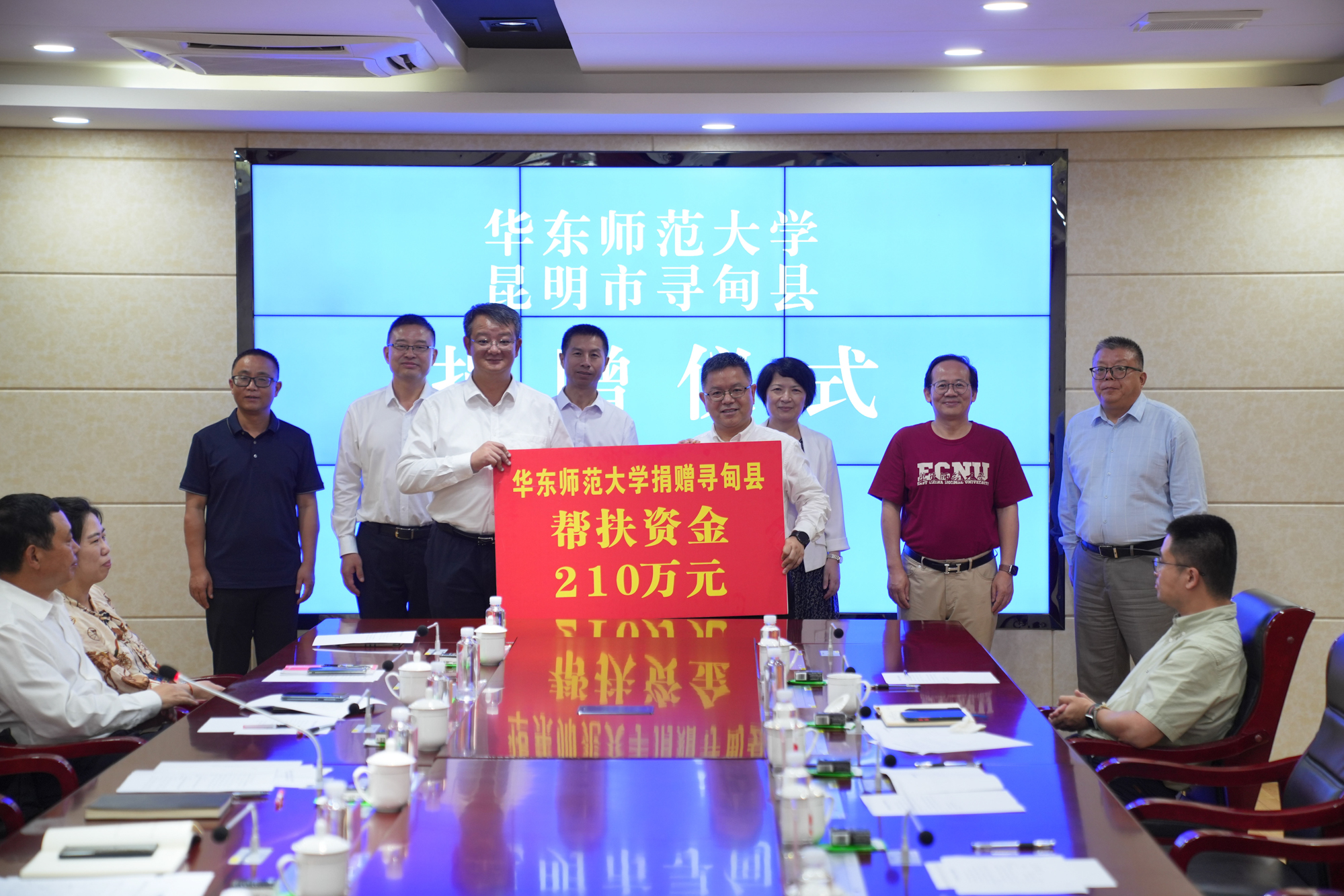 在对口帮扶座谈会上,华东师大向寻甸县捐赠210万元;华东师大工会与寻甸县供销社签订新一轮农副产品销售协议