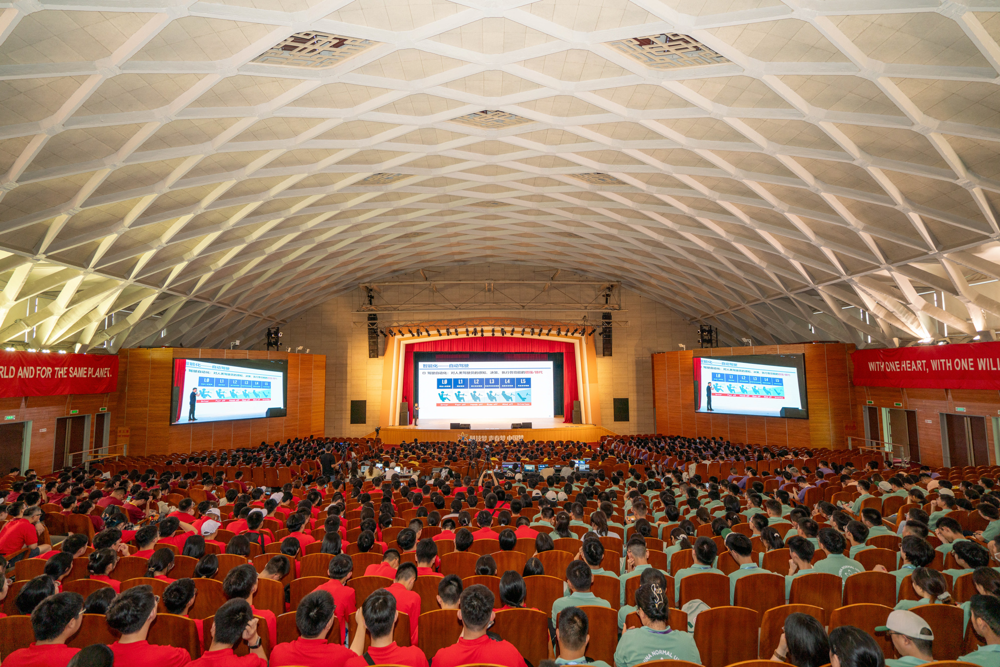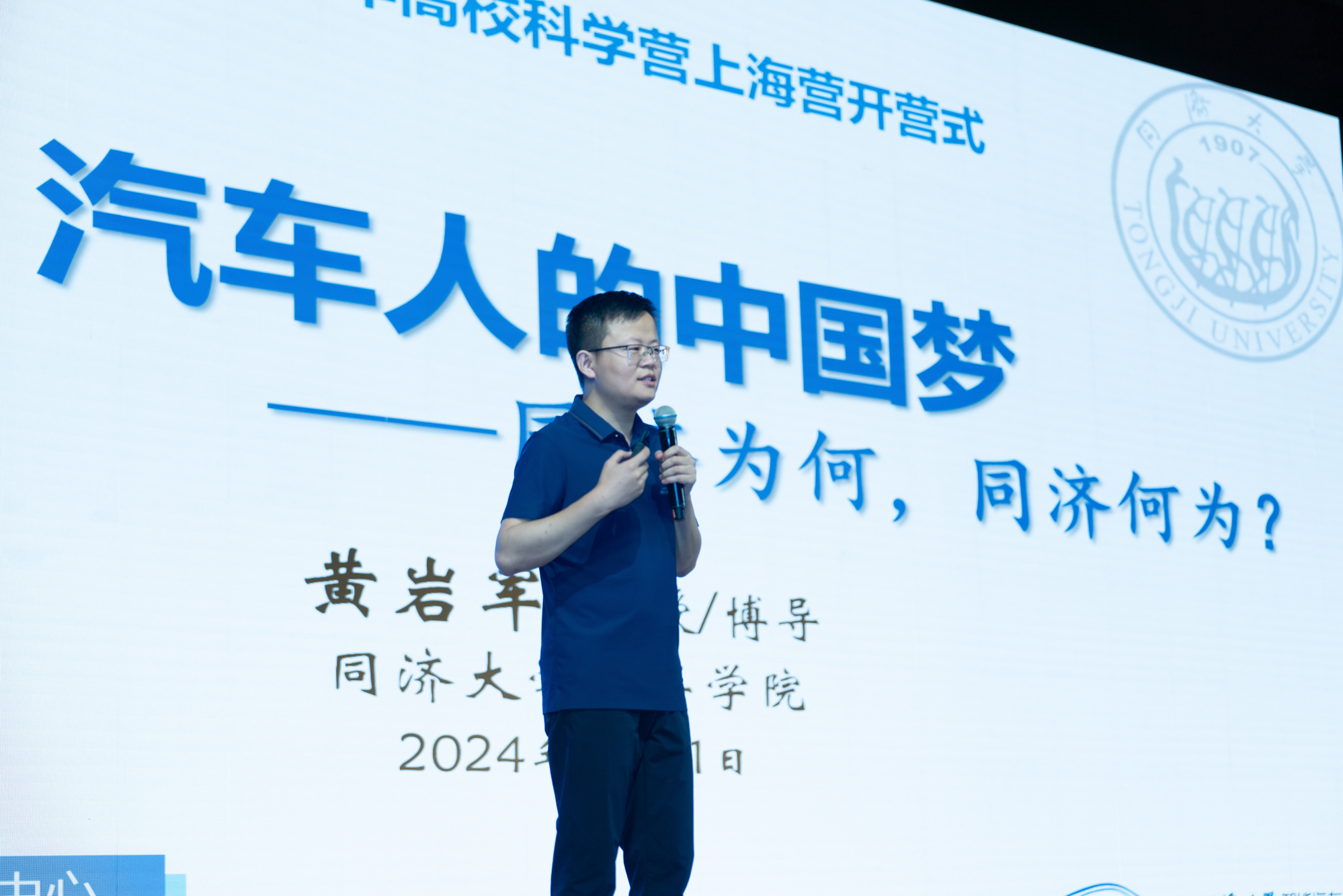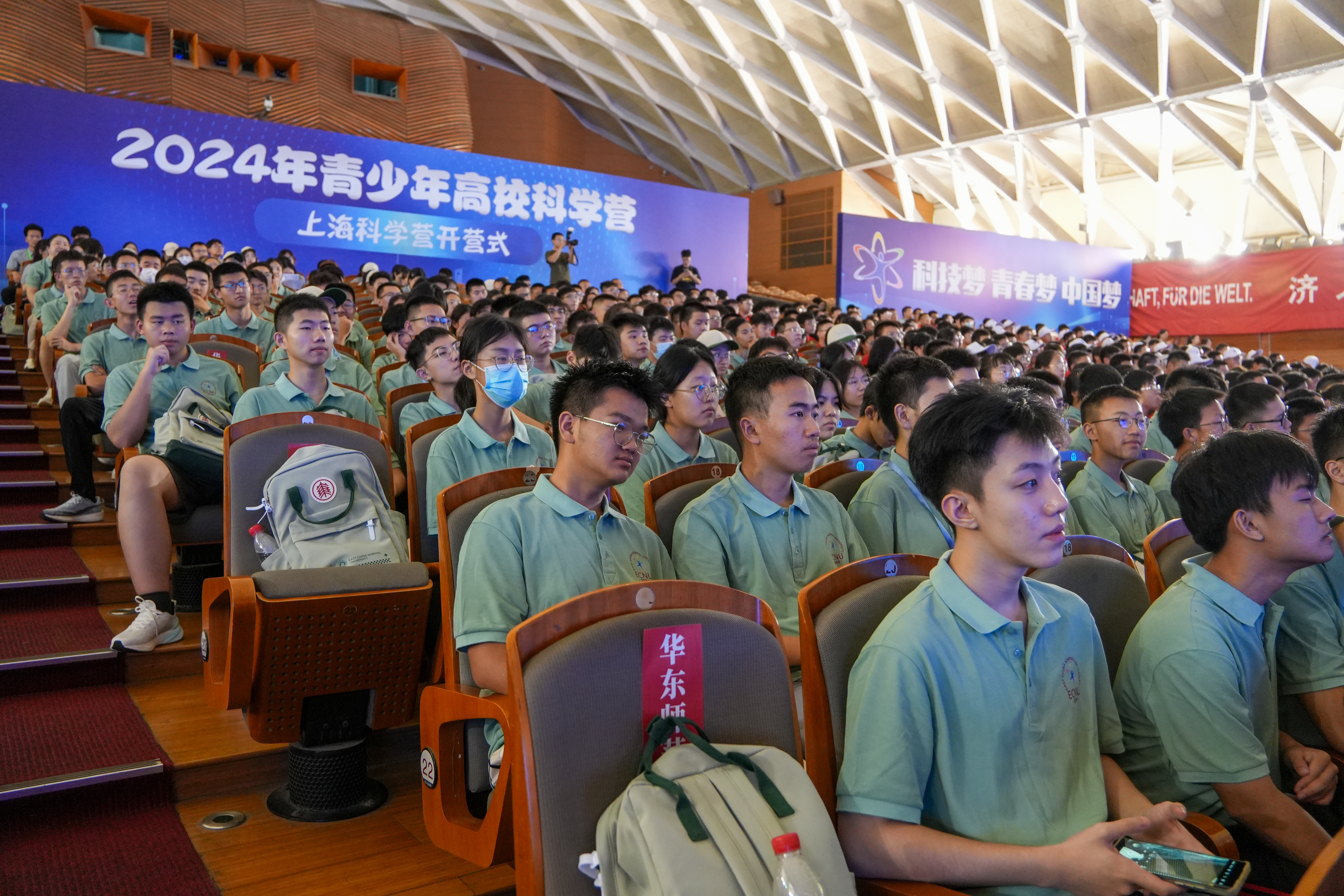 21日上午,2024年青少年高校科学营上海科学营开营式在同济大学举行。上午9时,营员们身着统一的营员服装抵达同济大学主校区大礼堂。开营式上,独唱、诗朗诵、民乐演奏等表演为大家带来一场视听盛宴。黄岩军教授担任主讲的开营讲座带领营员了解了我国汽车工业的成长史与未来展望。各省市的营队报到仪式则将开营式的气氛推向高潮。会场里,营员们纷纷举起手机,记录下这难忘的一刻。