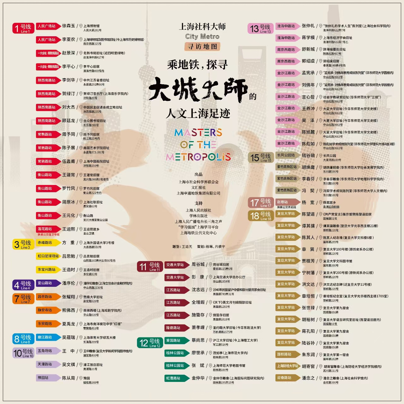 《上海社科大师City Metro寻访地图》8月17日起,包括金沙江路站地铁站等十个地铁车站,可免费领取到大师地图,限量5000份。开学后,主办方还向大师所属高校、研究机构赠送一批大师地图。