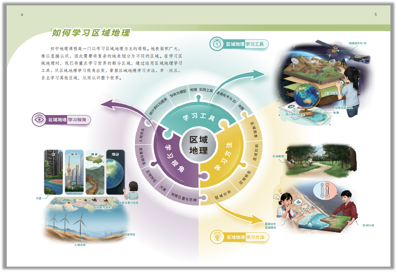 义务教育地理课程内容应贴近生活,关注自然与社会,具有生活性、实践性和综合性等性质。本套教材创新编排体系,在搭建架构教材时,采用“真实世界问题驱动式”架构。