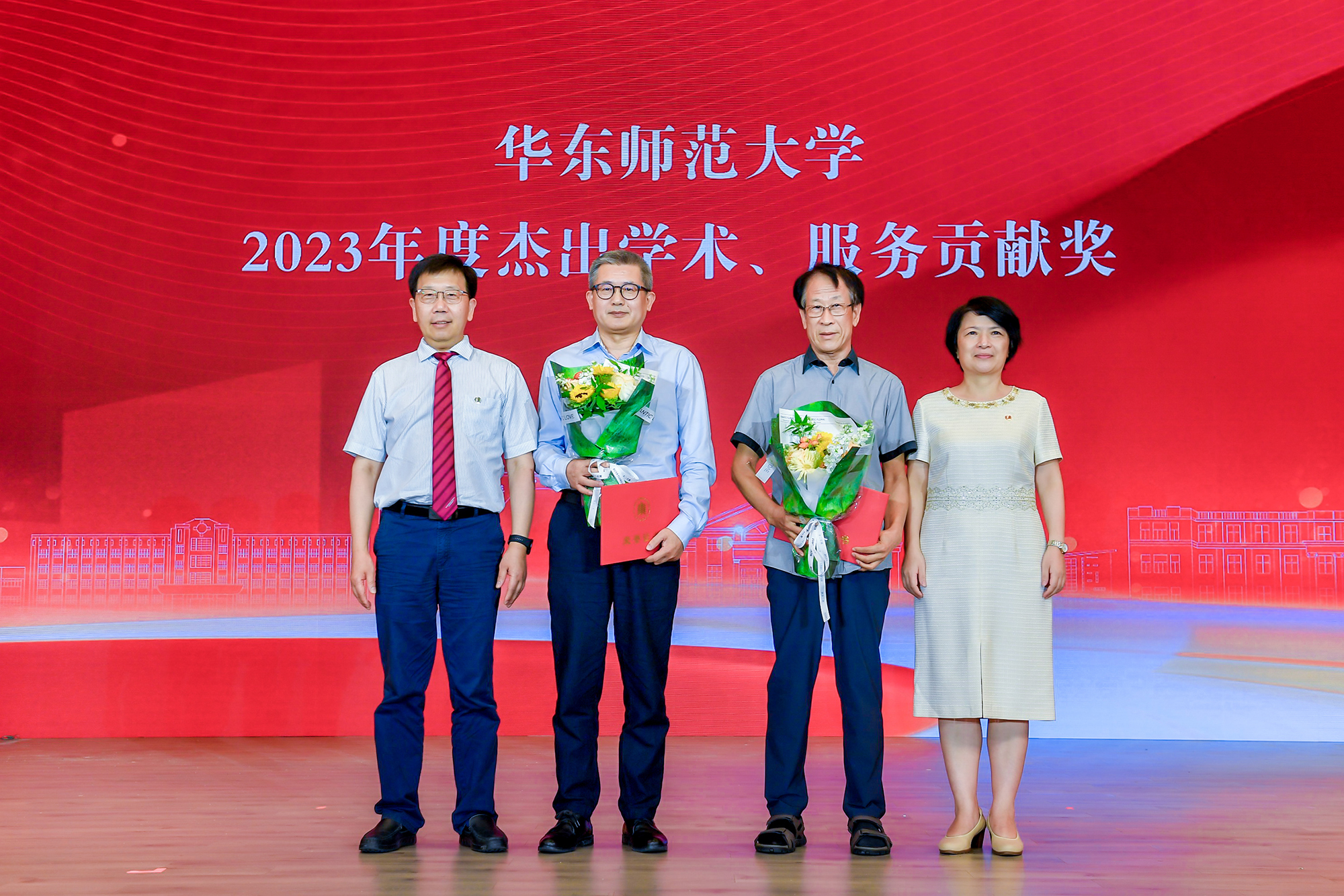 在热烈的掌声中,校领导梅兵、钱旭红、曹友谊、孟钟捷、戴立益、施国跃、程静,分别为学校2023年度育人贡献奖、学术贡献奖、服务贡献奖获得者,第十四届师德标兵荣誉称号获得者,满30年教育工作龄的教师颁发证书,今年新入职的教师代表向受表彰的教师献花致敬。