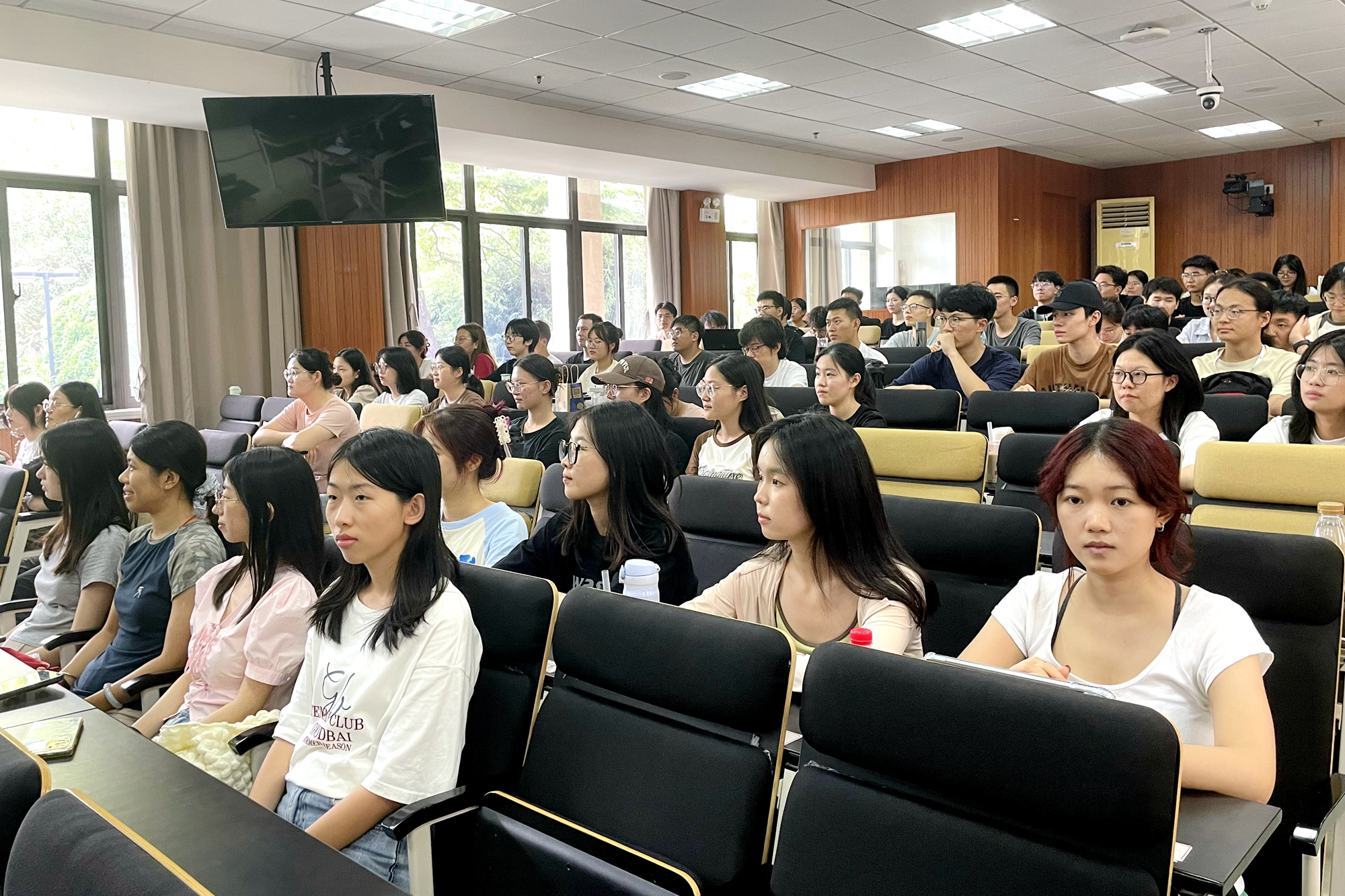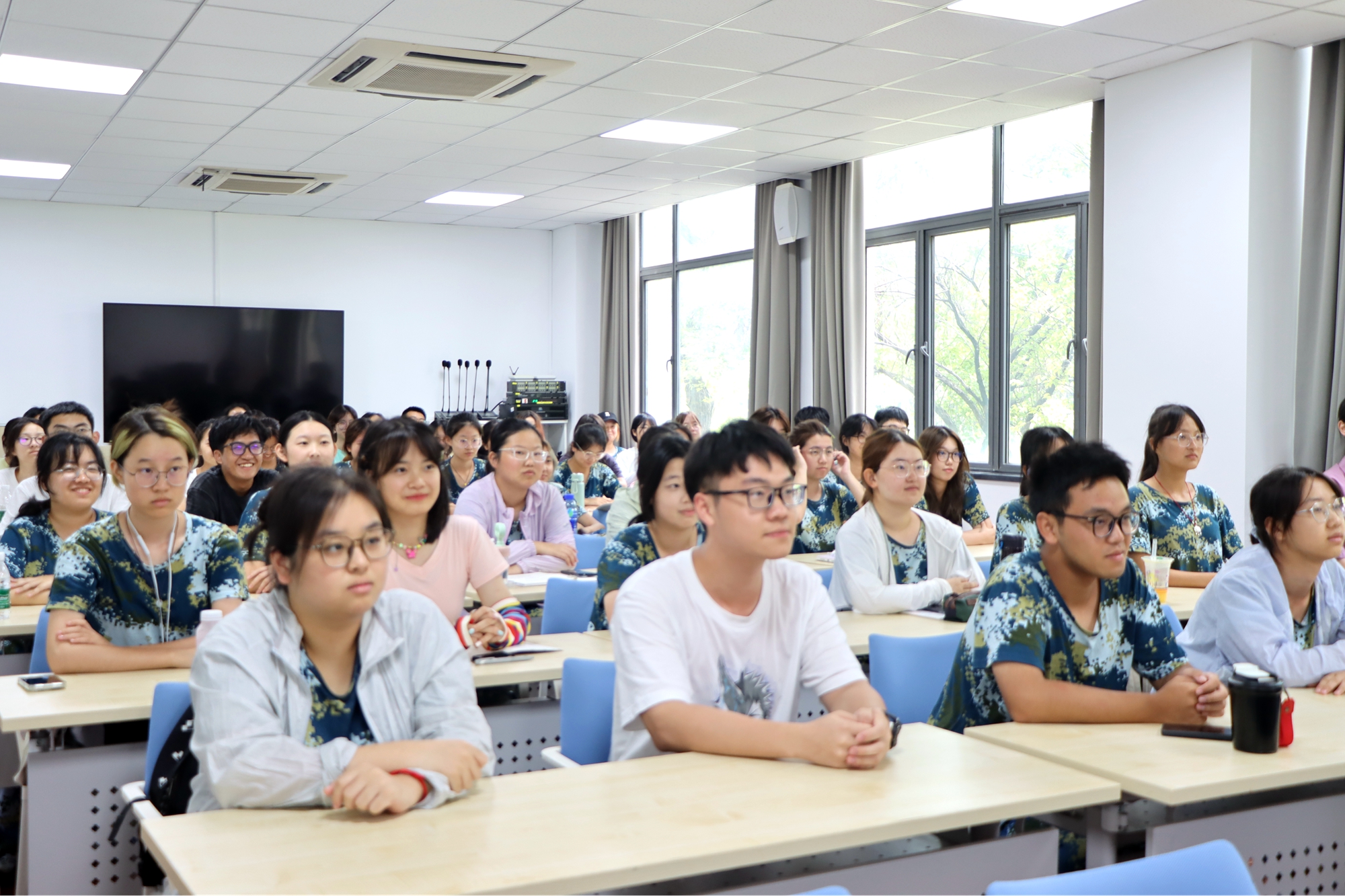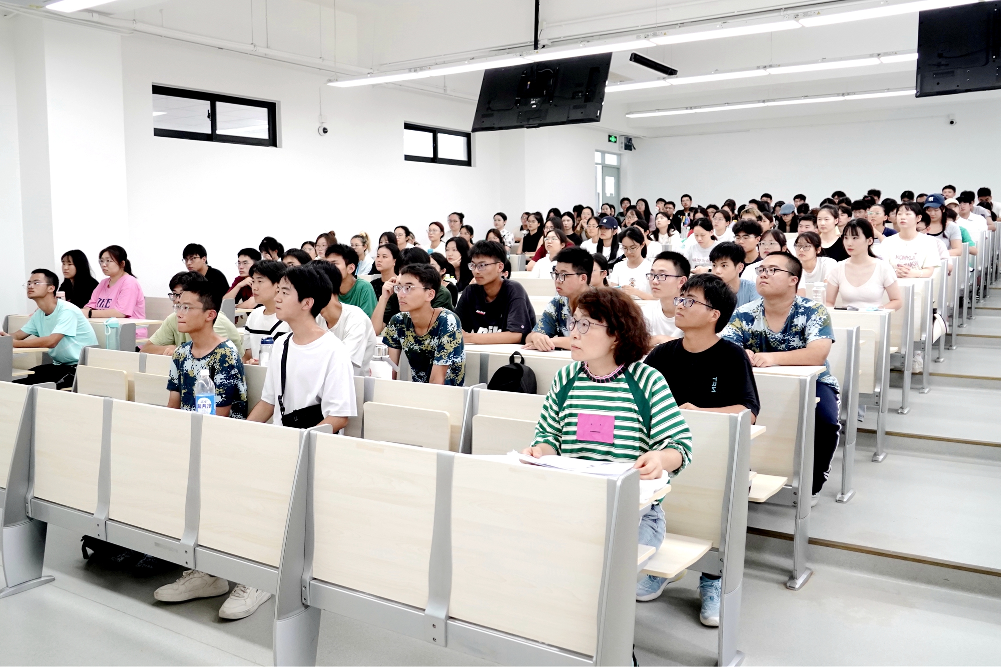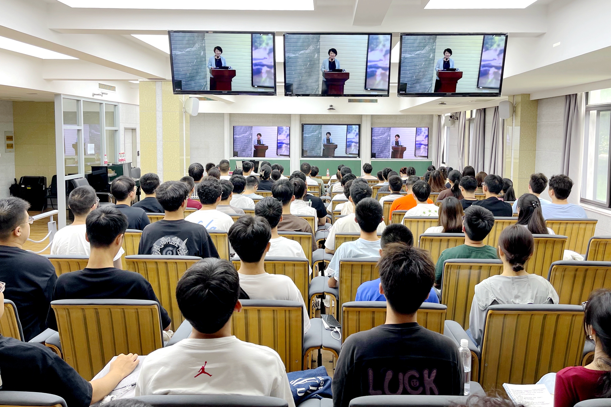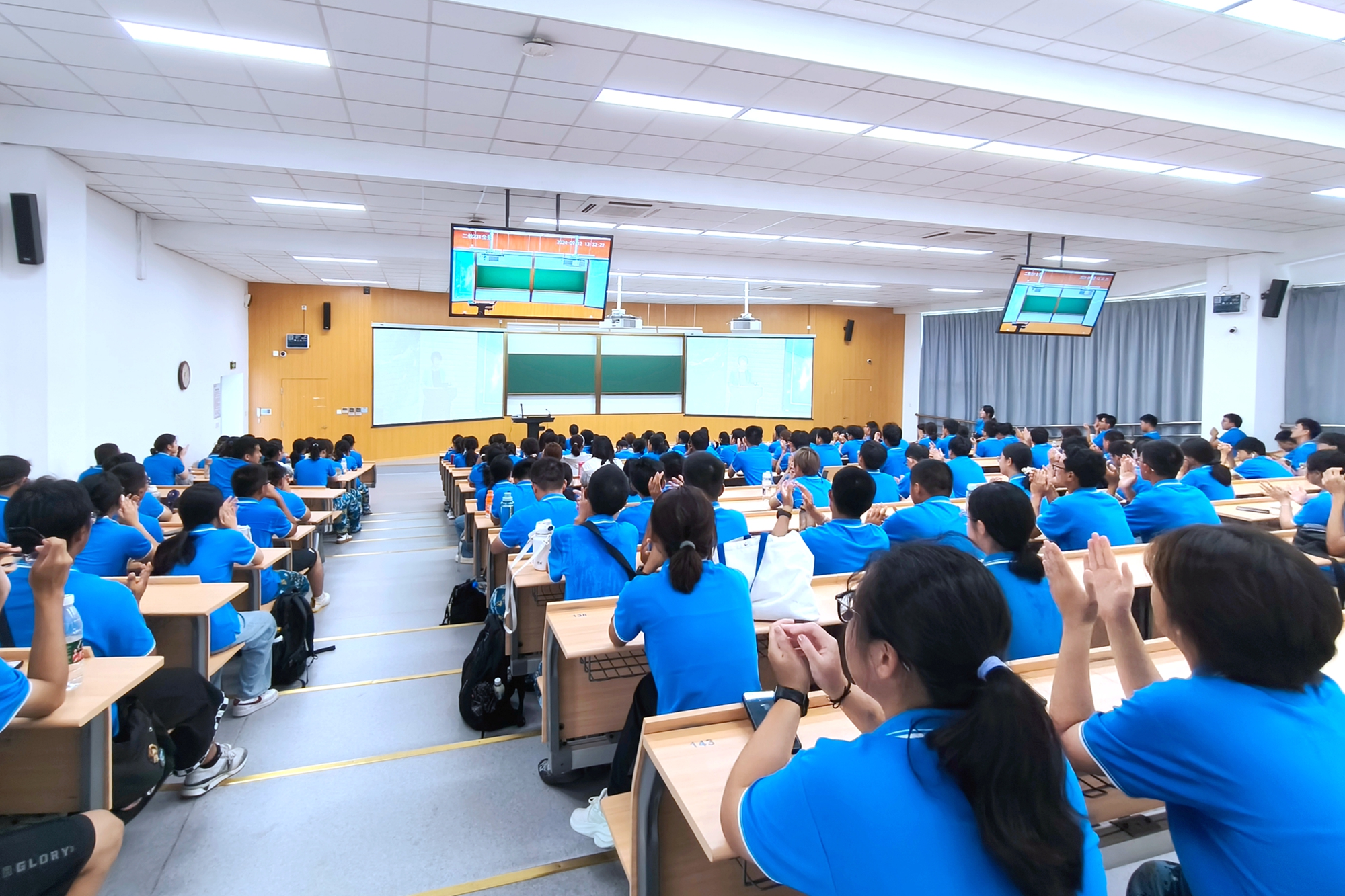 本次课程采用“线上+线下”结合的方式举行,在闵行、普陀两校区设置线下集中会场,各院系设置分会场,课程还通过校园网平台同步直播,全校近万名2024级新生共同学习。