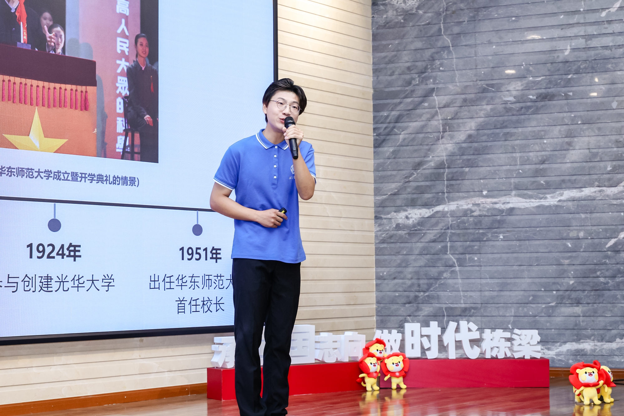 与往年不同的是,今年新生第一课还邀请了三位“小讲师”助阵。他们是来自公共管理学院、大夏书院2023级本科生薛靖桐,政治与国际关系学院、光华书院2023级本科生李珏瑾以及马克思主义学院、孟宪承书院2022级本科生李自其。三位同学分别讲述了大夏大学、光华大学和圣约翰大学的校史故事。