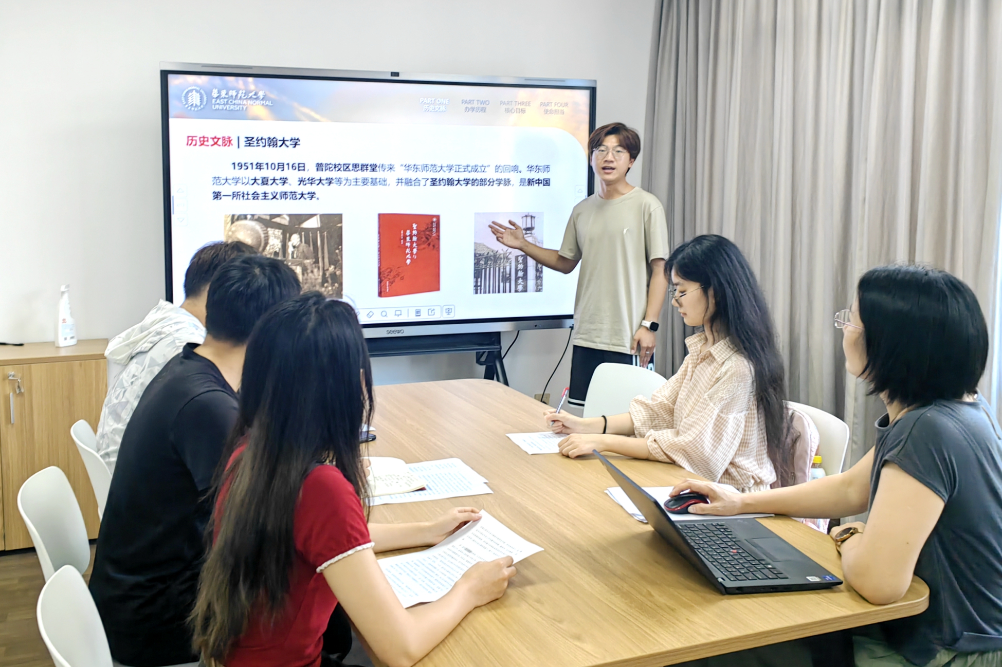 曾担任大夏校史讲解员的薛靖桐和光华校史宣讲团成员的李珏瑾,积极参与校史寻访相关活动,将在实践中的收获融入到自己的讲述中;李自其与同学们组成研讨小组,共同梳理校史故事,用实际行动践行文脉传承。