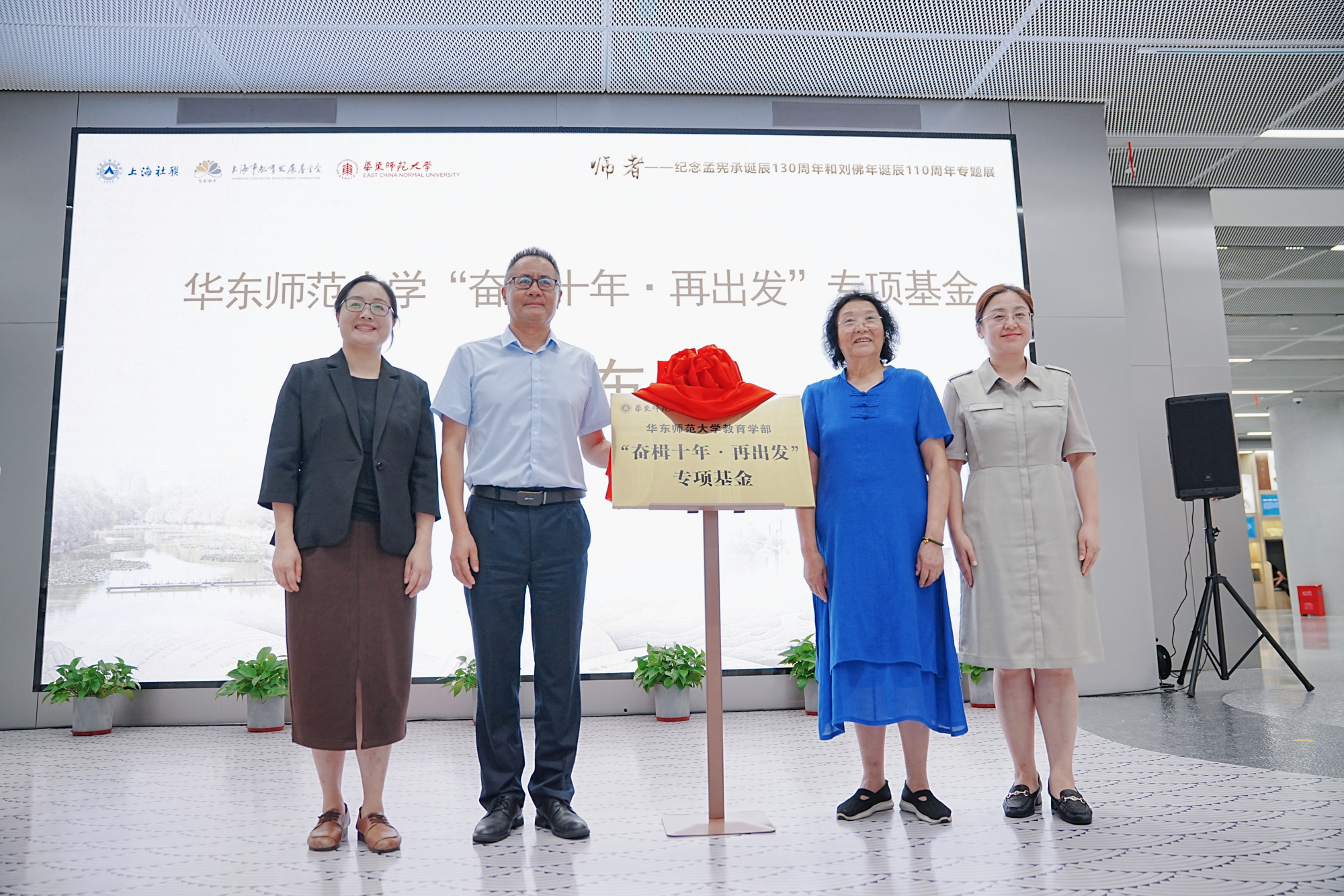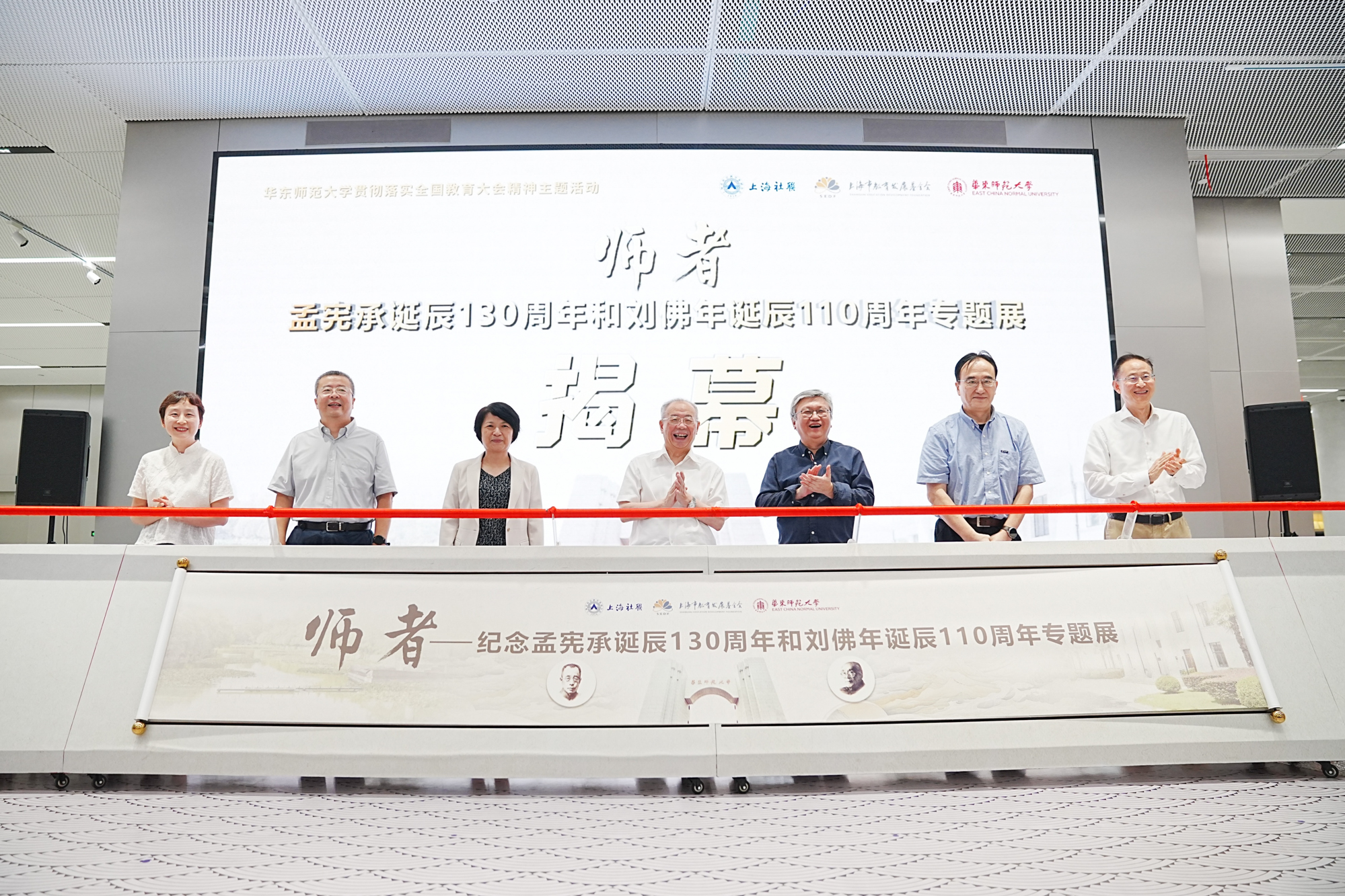 上海市教育发展基金会理事长王荣华、副理事长蒋红,上海市社会科学界联合会党组书记、专职副主席王为松,专职副主席任小文,华东师大党委书记梅兵、教育学部主任袁振国,孟宪承家属孟冰纹等出席开幕式并为“师者——纪念孟宪承诞辰130周年和刘佛年诞辰110周年专题展”揭幕。