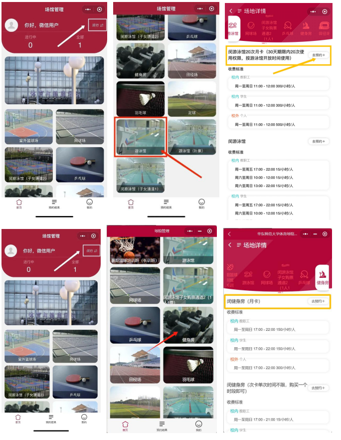说明:月卡可通过3245澳门新莆京体育场馆管理系统小程序内“游泳馆月卡预约”或“健身房月卡预约”通道进行购买。月卡自办理日起有效期为30日。其中,游泳馆月卡有效期内可使用20次。健身房月卡有效期内不限使用次数,无论健身器械还是团操课程任你随意使用。