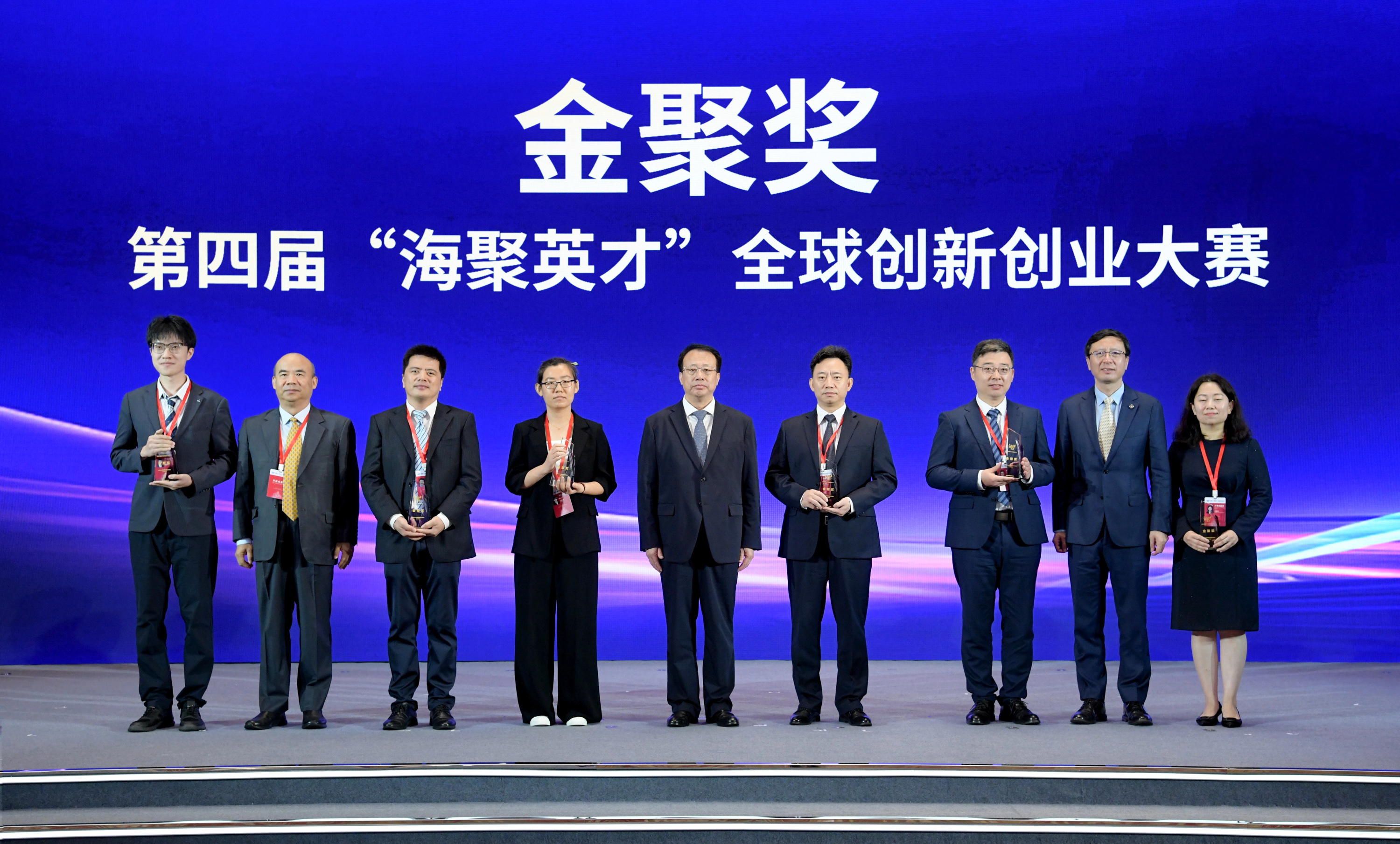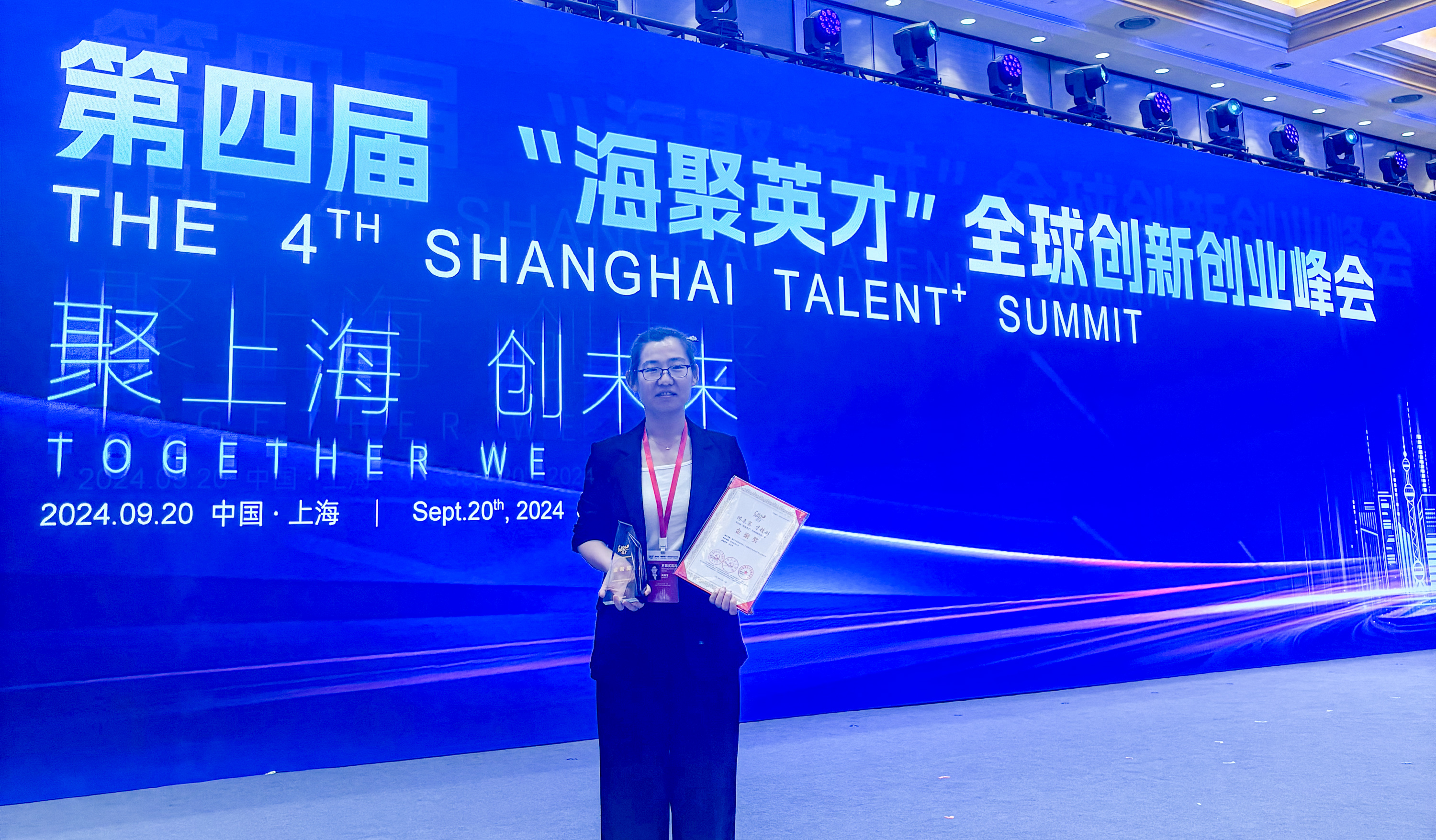 上海市委副书记、市长龚正为第四届“海聚英才”全球创新创业大赛获奖选手颁发金奖(左四为冯英慧)