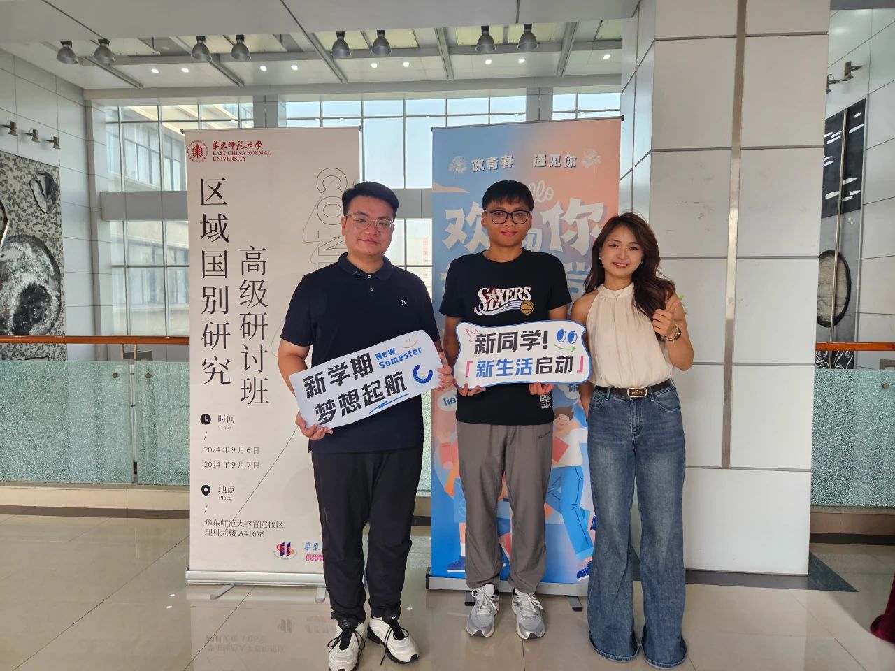 9月6日,李坤璘到政治与国际关系学院报到(左一)