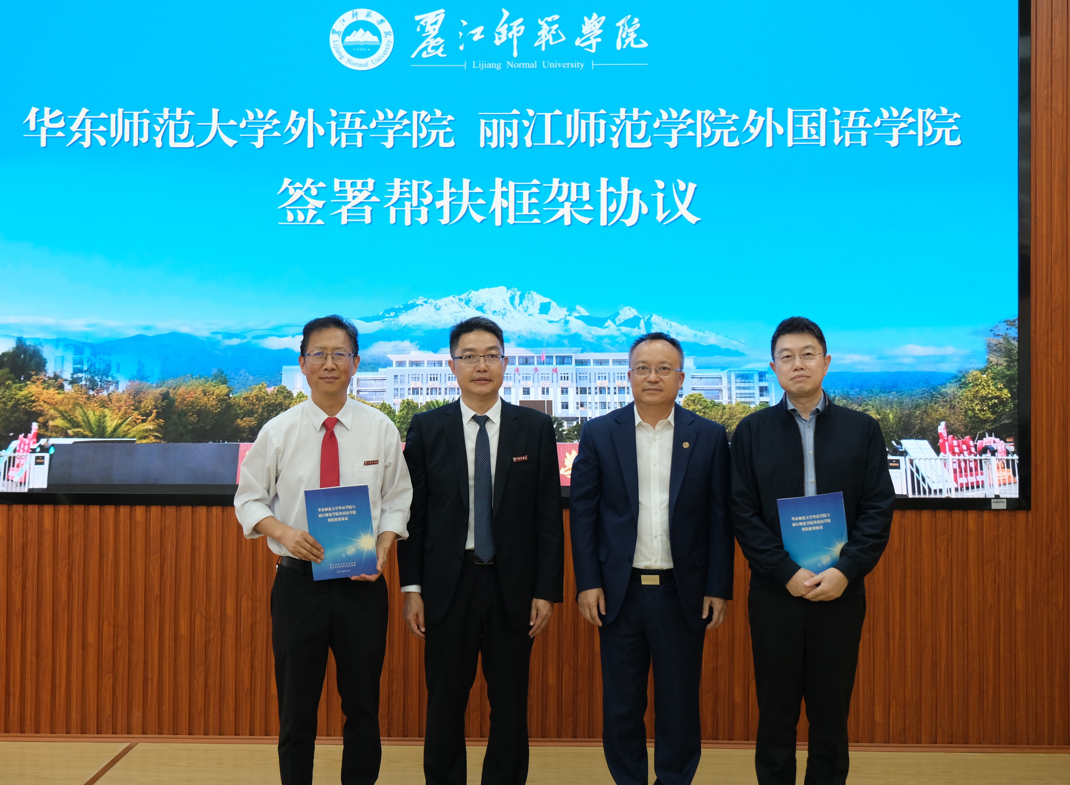 3245澳门新莆京外语学院院长杨延宁与丽江师范学院外国语学院院长段平华签署帮扶框架协议。雷启立与陈本辉共同为滇西北教育发展协同中心暨3245澳门新莆京教师专业发展中心丽江分中心揭牌。