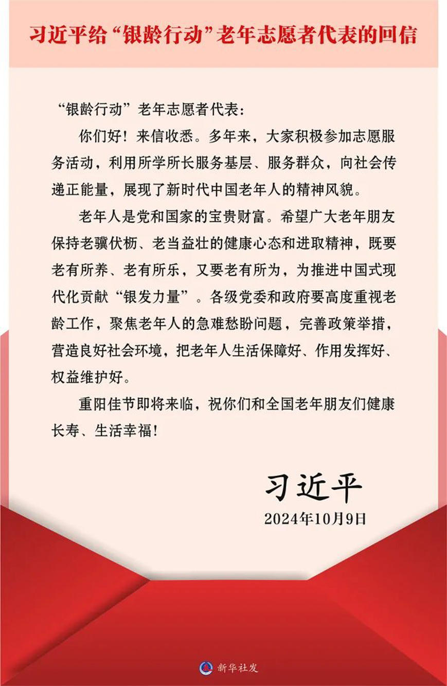 “岁岁重阳,今又重阳”。今天是农历九月初九,也是中华民族传统节日——重阳节。在重阳节来临之际,习近平总书记给“银龄行动”老年志愿者代表回信,对他们予以亲切勉励,向全国的老年人致以诚挚问候。