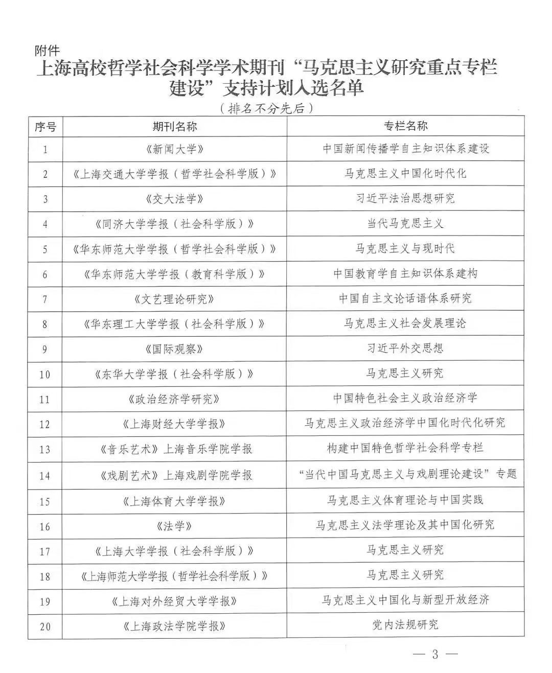 近日,上海市教育卫生工作委员会、上海市教育委员会公布了上海高校哲学社会科学学术期刊“马克思主义研究重点专栏建设”支持计划入选名单,全市共有20家期刊入选。《3245澳门新莆京学报(哲学社会科学版)》《3245澳门新莆京学报(教育科学版)》和《文艺理论研究》三本期刊的栏目入选该计划。