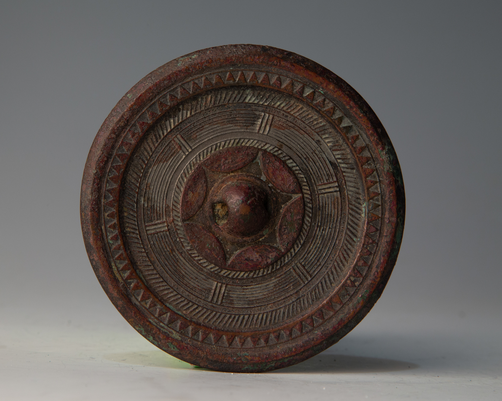 几何纹是早期铜镜的典型纹饰,弦纹、连弧纹、涡云纹是几何纹铜镜的几种主要形态。本次展出的多面连弧纹即体现了古人的制镜艺术,其中连弧镜多为存世较多的八连弧和十六连弧镜,也有六连弧,十连弧等铜镜。