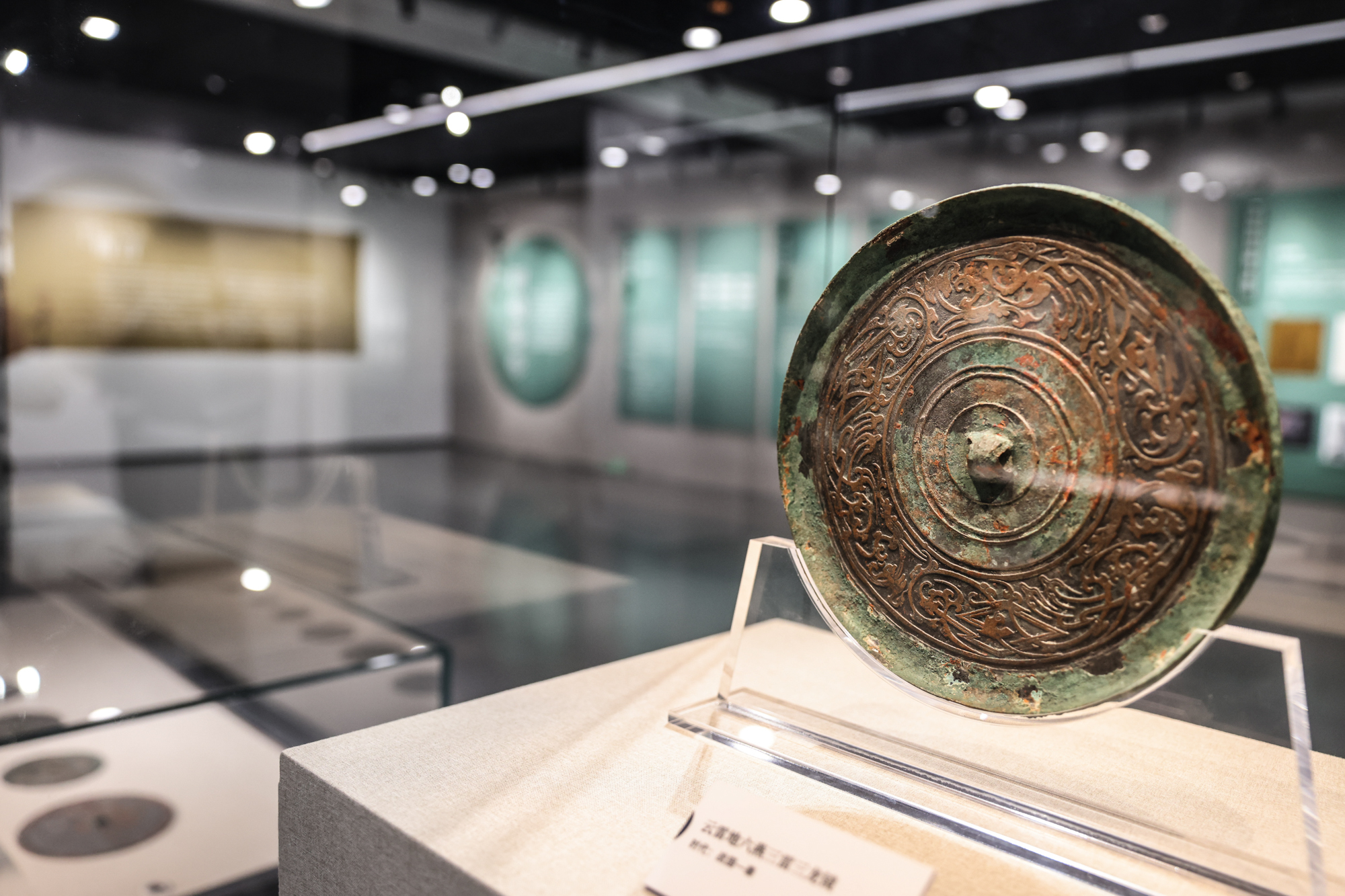 本次展览以“秦汉止水”为主题,分“明镜鉴形”“方圆殊趣”“飞龙在天”和“巧刻文章”四个单元展示先秦至秦汉时期的100面珍贵铜镜。这批铜镜,跨越了春秋战国至东汉中晚期至三国六朝,时间跨度长,类型丰富,涵盖了几何纹、动物纹、铭文等多种纹饰类型。