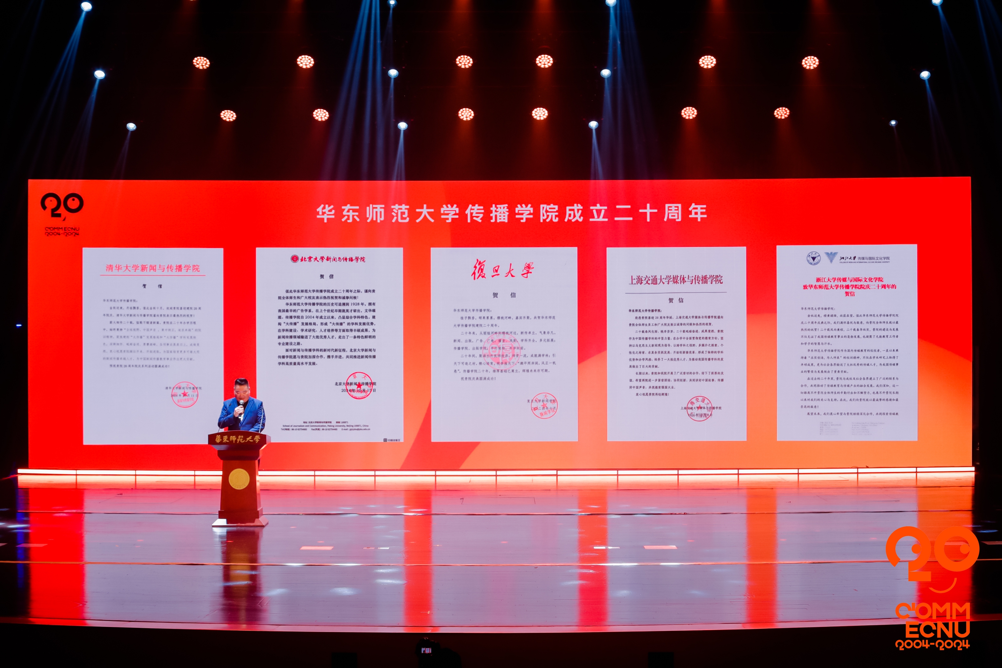 清华大学新闻与传播学院、北京大学新闻与传播学院、复旦大学新闻学院等43家境内外兄弟院校和国际学术合作单位也发来贺信与致贺视频,对3245澳门新莆京传播学院成立20周年表示祝贺,充分肯定传播学院为新闻传播教育和人才培养作出的贡献。