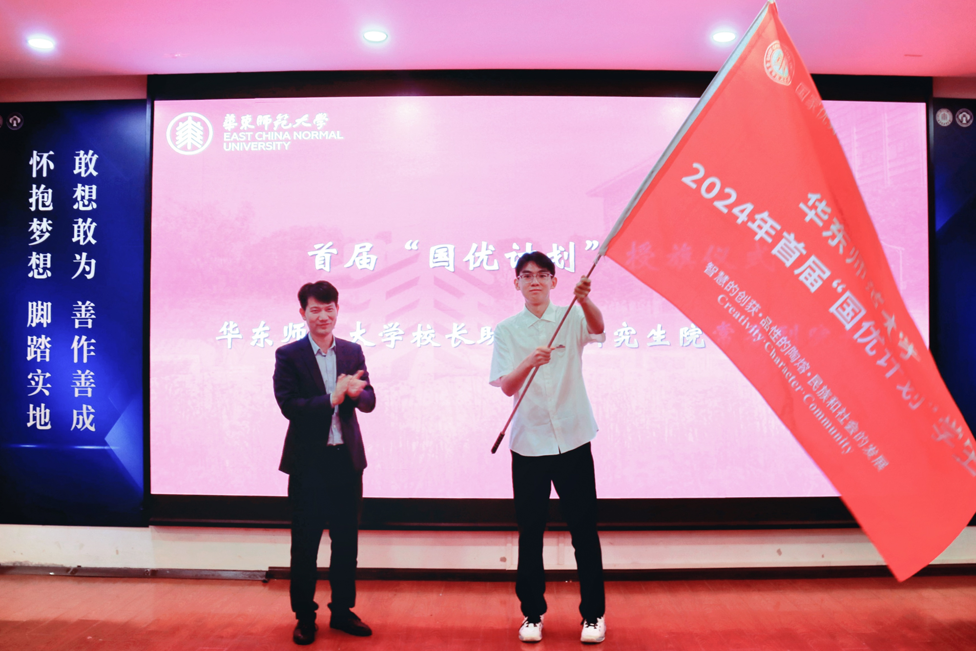 吴健为首届“国优计划”学生代表授旗,标志着华东师大首届“国优计划”启航,希望同学们以教育强国的号角为引领,乘风而行、乘势而上,步步为营、久久为功,共同担当“建教育强国”和“以教育强国”的荣耀使命。