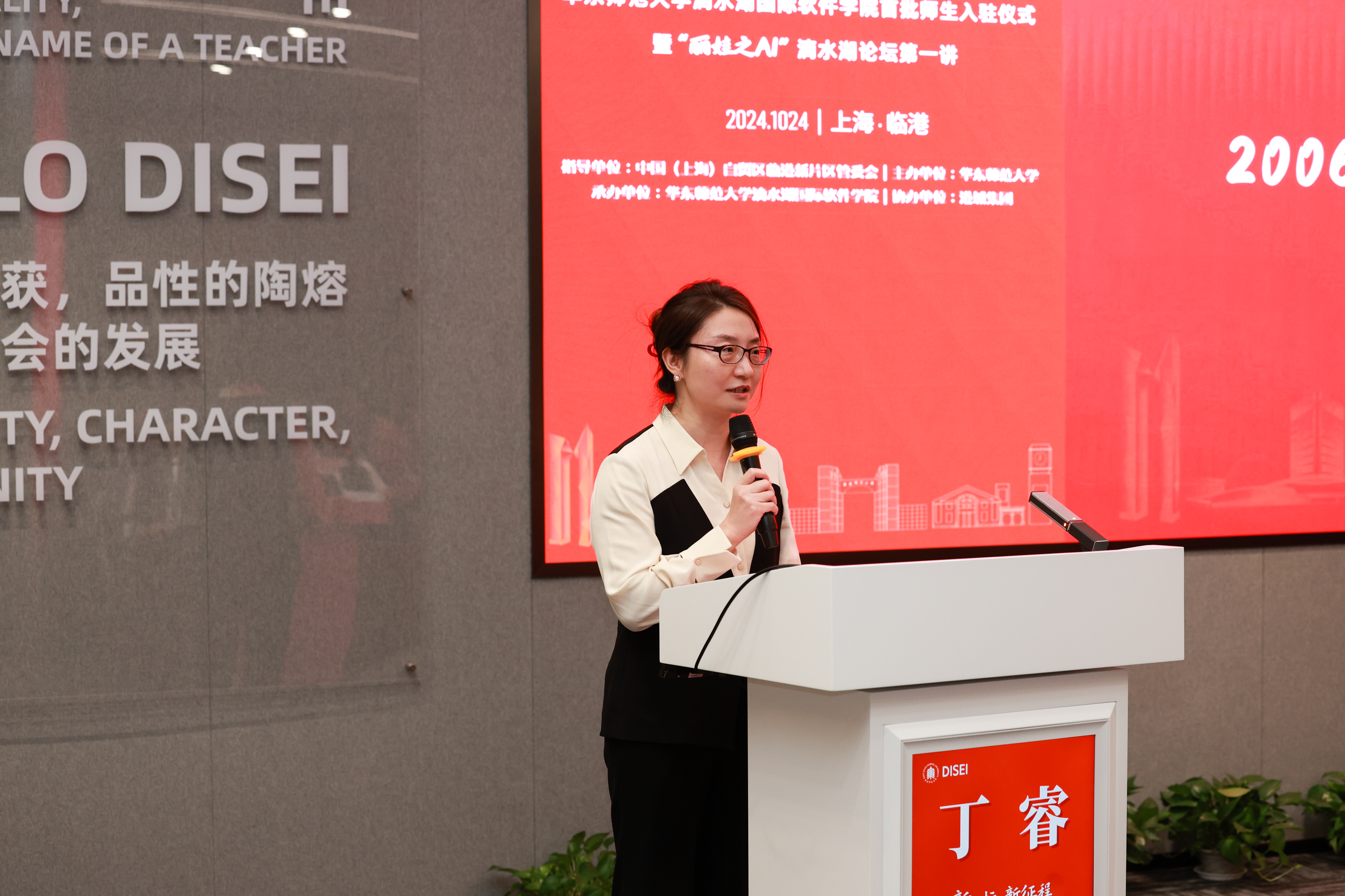 现任临港新片区数据跨境服务中心主任丁睿,是2002年华东师大软件学院获批成立后的首批学生。她受邀来到入驻仪式现场,以亲身经历诚挚欢迎学弟学妹们,一起用智慧与热情为临港这片热土增添更加璀璨的光彩。22年前,丁睿怀揣着对“软件技术改变世界”的憧憬,迈入华东师大软件学院大门。看到母校在临港再创业,她深感振奋,“开拓创新、勇立潮头的精神深深印刻在每位华东师大软件人的基因之中”。