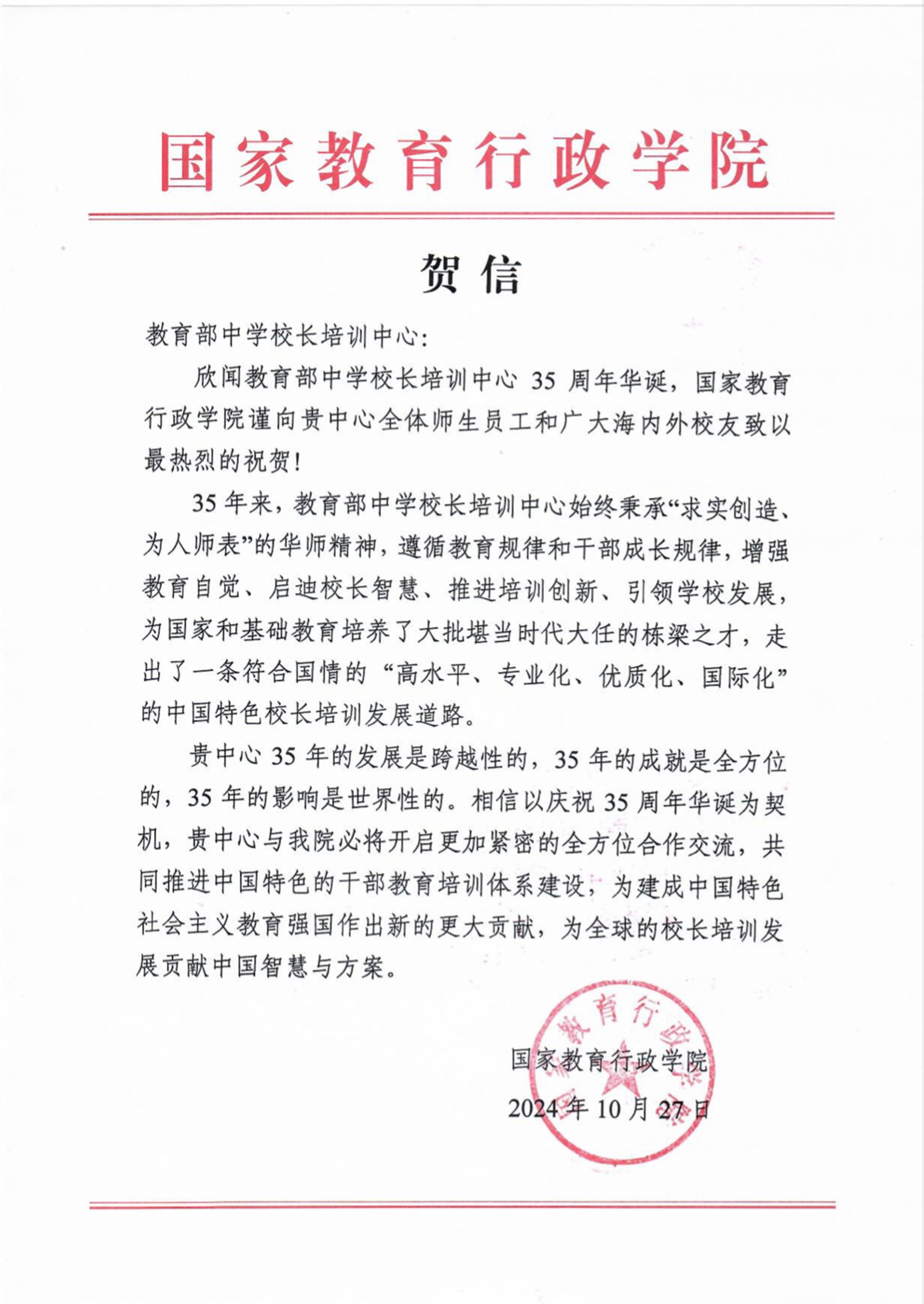国家教育行政学院发来贺信说,35年来,校长培训中心始终遵循教育规律和干部成长规律,增强教育自觉、启迪校长智慧、推进培训创新、引领学校发展,为国家和基础教育培养了大批堪当时代大任的栋梁之才,走出了一条符合国情的“高水平、专业化、优质化、国际化”的中国特色校长培训发展道路。面向未来,国家教育行政学院将与校长培训中心开展更加紧密的全方位合作交流,共同推进中国特色的干部教育培训体系建设。教育部中小学校长和幼儿园园长国家级培训项目管理办公室主任于维涛宣读了贺信。