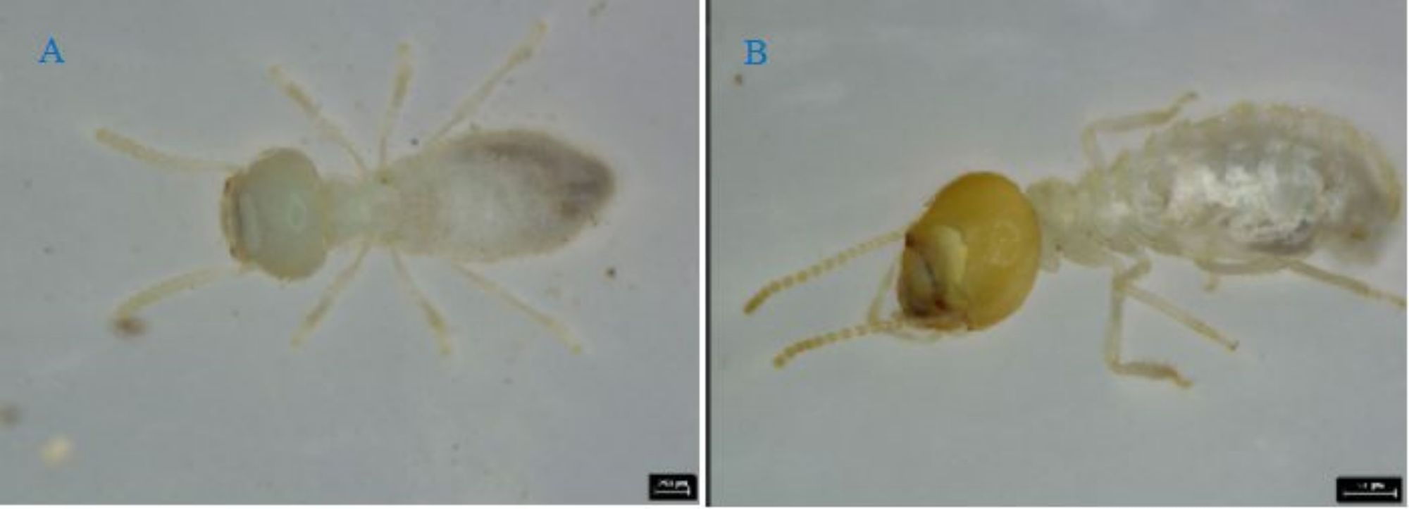 图1. 两种体型和口器发达程度不同的白蚁。A为小体型白蚁(Reticulitermes periflaviceps Ping&Xu,1993),B为大体型白蚁(Odontotermes formosanus Shiraki,1909)。