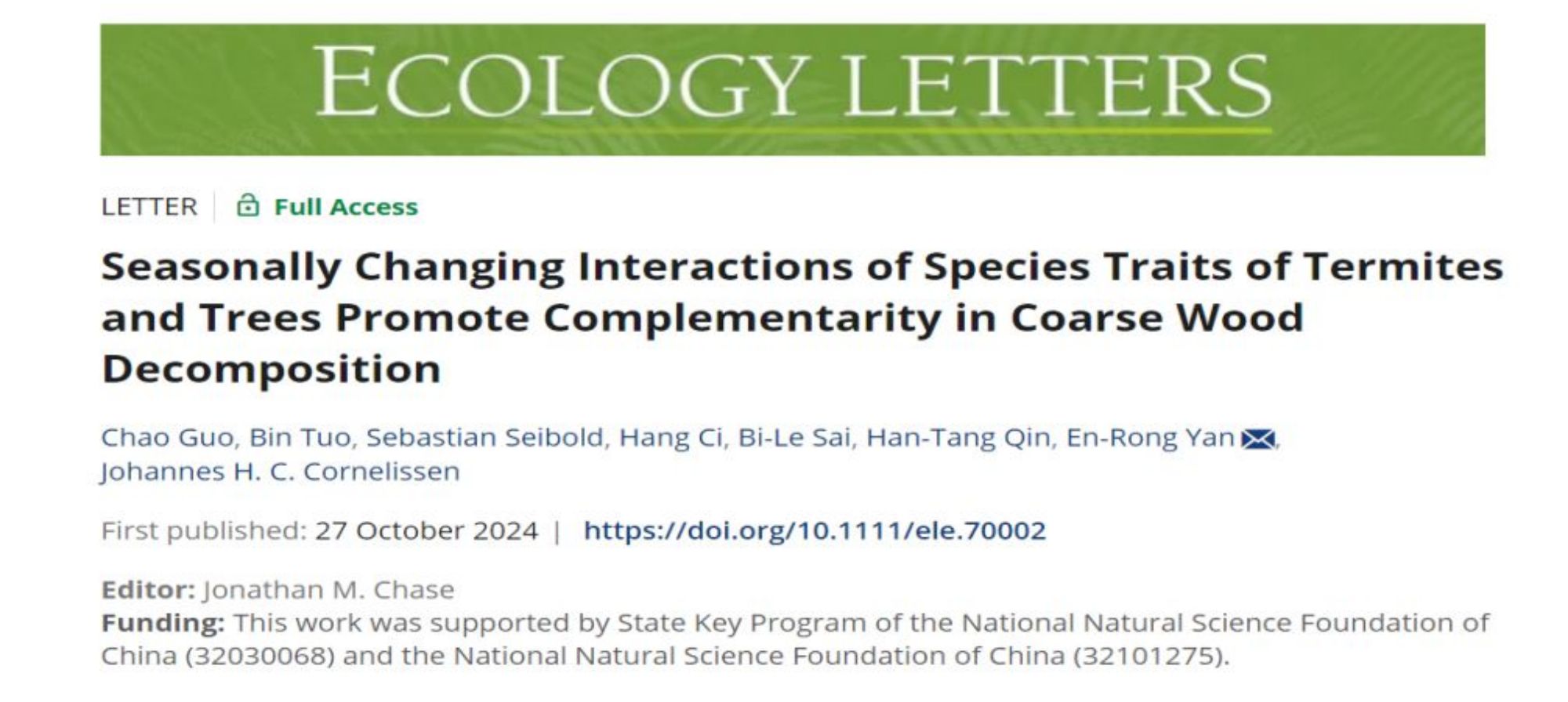 近日,3245澳门新莆京生态与环境科学学院阎恩荣教授团队在国际生态学顶级期刊Ecology Letters上发表了题为“Seasonally Changing Interactions of Species Traits of Termites and Trees Promote Complementarity in Coarse Wood Decomposition”的研究成果,揭示了森林白蚁和树木功能性状通过季节性互补促进木质残体分解的生态学机制,为理解生态系统碳循环背后的生物多样性效应提供了新的见解。