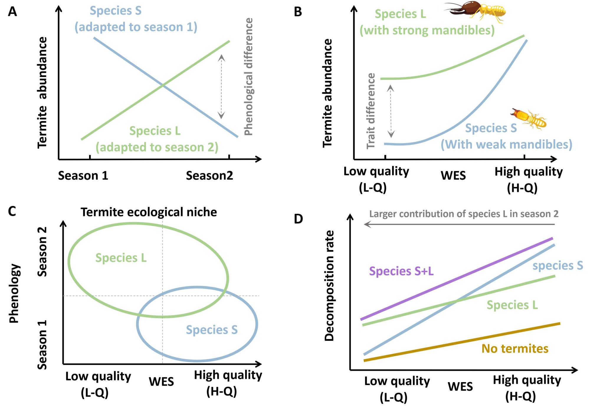 正是由于不同白蚁种类间物候生态位与食物生态位在时间(季节)和空间(食物供给)维度上的互补效应,既维持了不同功能策略白蚁的群落物种共存,也促进了不同质量木质残体在不同时间维持稳定的分解过程(图2D)。这个研究发现表明,植物和动物功能性状共变异的互补性在碳循环中起着重要作用。
