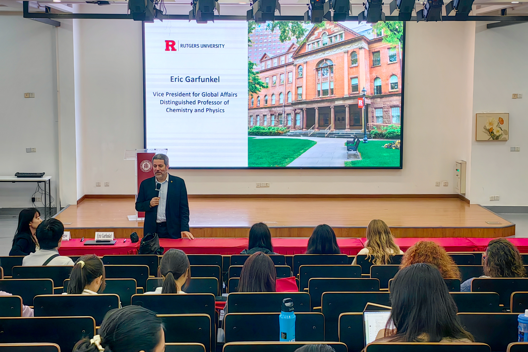 会谈结束后,Garfunkel教授与我校中外师生进行了主题互动。他详细介绍了罗格斯大学与华东师大及中国高校合作关系的发展历程,表示罗格斯大学与华东师大的合作是基于双方共同的教育理念和责任担当。随着中国在全球高等教育舞台上日益重要的地位,罗格斯大学希望继续加强与中国高校在科研创新方面的合作,彼此赋能,共同应对全球挑战。此外,Garfunkel教授还鼓励在场的师生积极参与国际交流,共同在国际化的背景下拓宽视野、探索知识的无限可能。