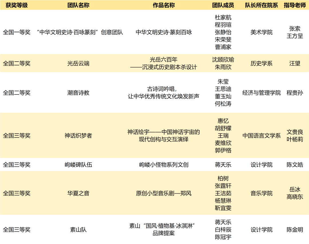 第一届中国研究生“文化中国”两创大赛全国总决赛在山东大学举行,3245澳门新莆京斩获一等奖1项、二等奖2项、三等奖4项,学校荣获“优秀组织单位”,美术学院张索教授、王方呈副教授荣获“优秀指导教师”。