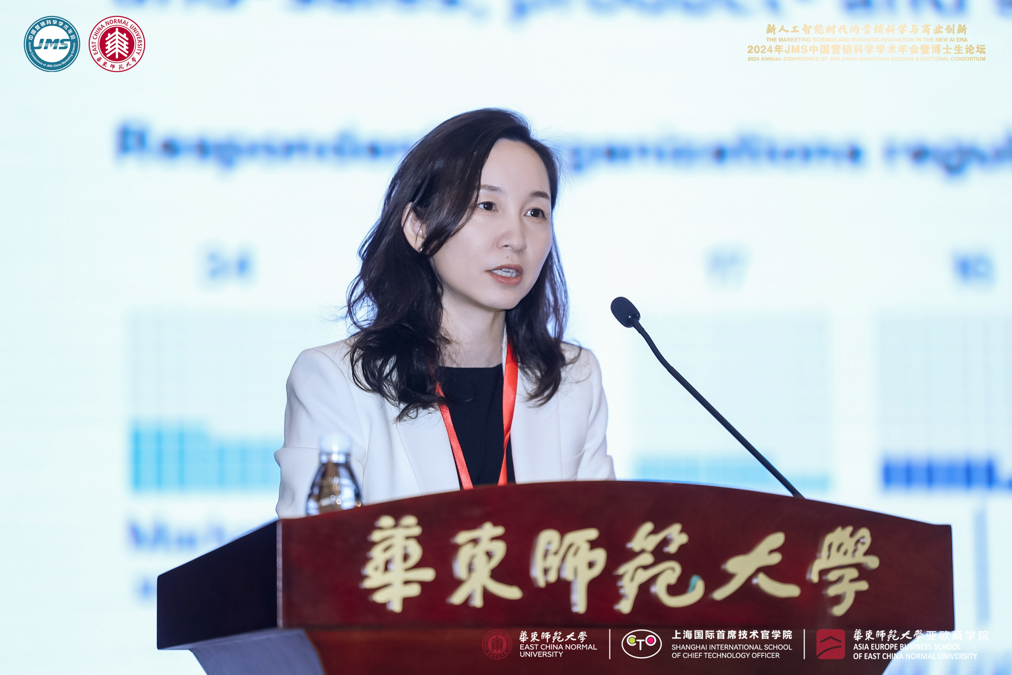 北京大学光华管理学院副院长沈俏蔚教授以“数智技术的营销应用:福利与治理视角”为题进行主旨演讲。她指出,营销科学是目前生成式AI最大的应用领域,同时,数智技术应用面临着隐私保护、人机交互、数据治理、算法偏见等潜在问题。技术的快速发展迫切需要学术研究跟进。