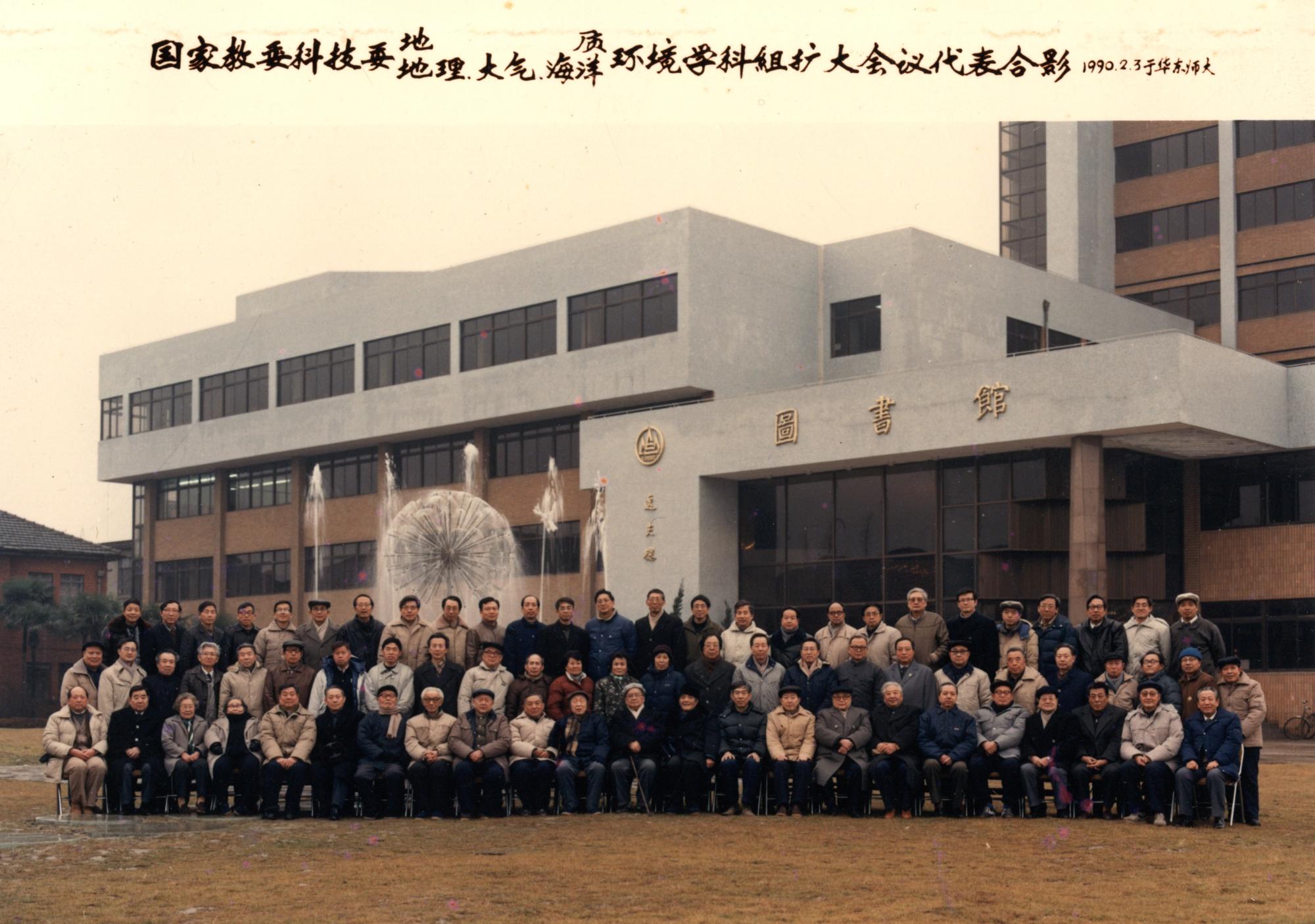 1990年2月3日国家教委科技委地质地理、大气、海洋环境学科组扩大会议代表合影。前排左3严重敏、左4周淑贞、左11胡焕庸、左13李春芬、左17陈吉余。
