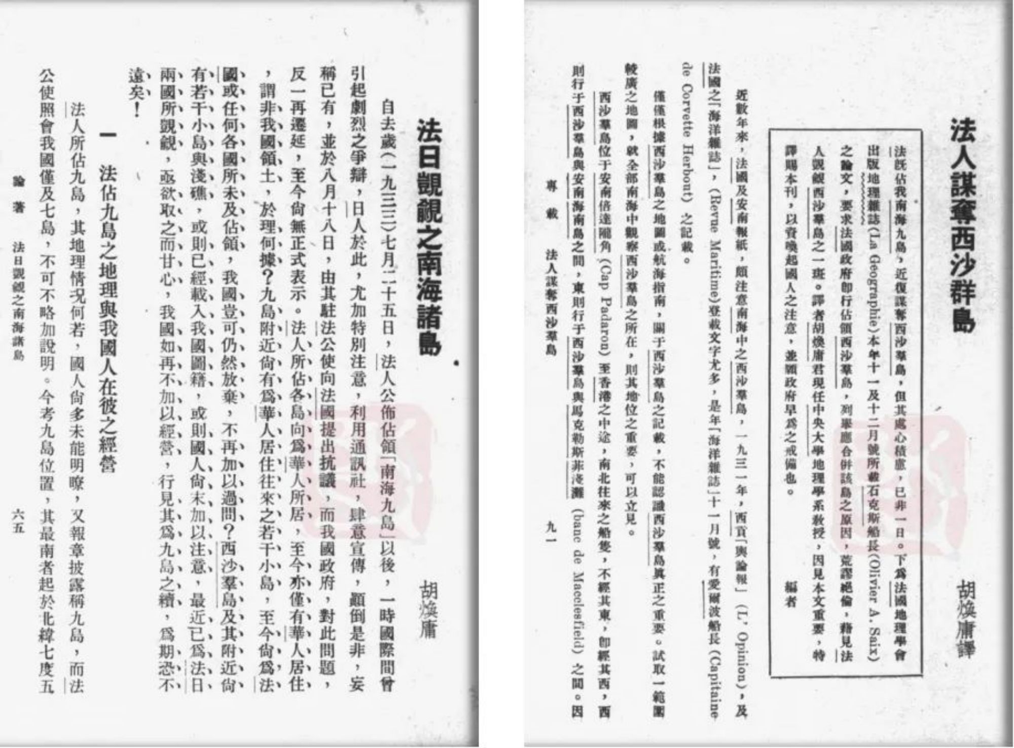 1934年,胡焕庸在《外交评论》刊物上发表《法日觊觎之南海诸岛》和《法人谋夺西沙群岛》