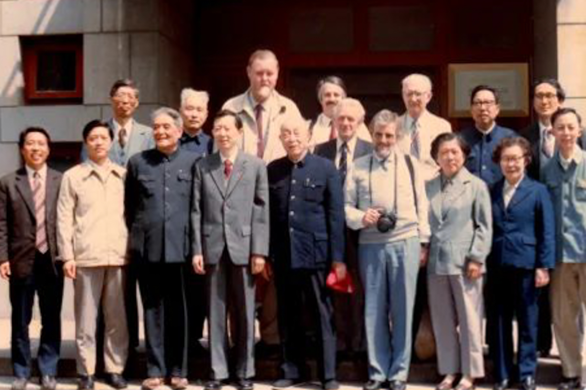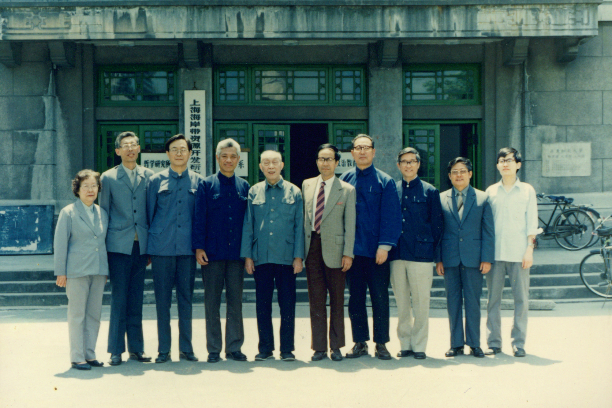 1980年代胡焕庸在华东师大校园理科三馆前与师生合影
