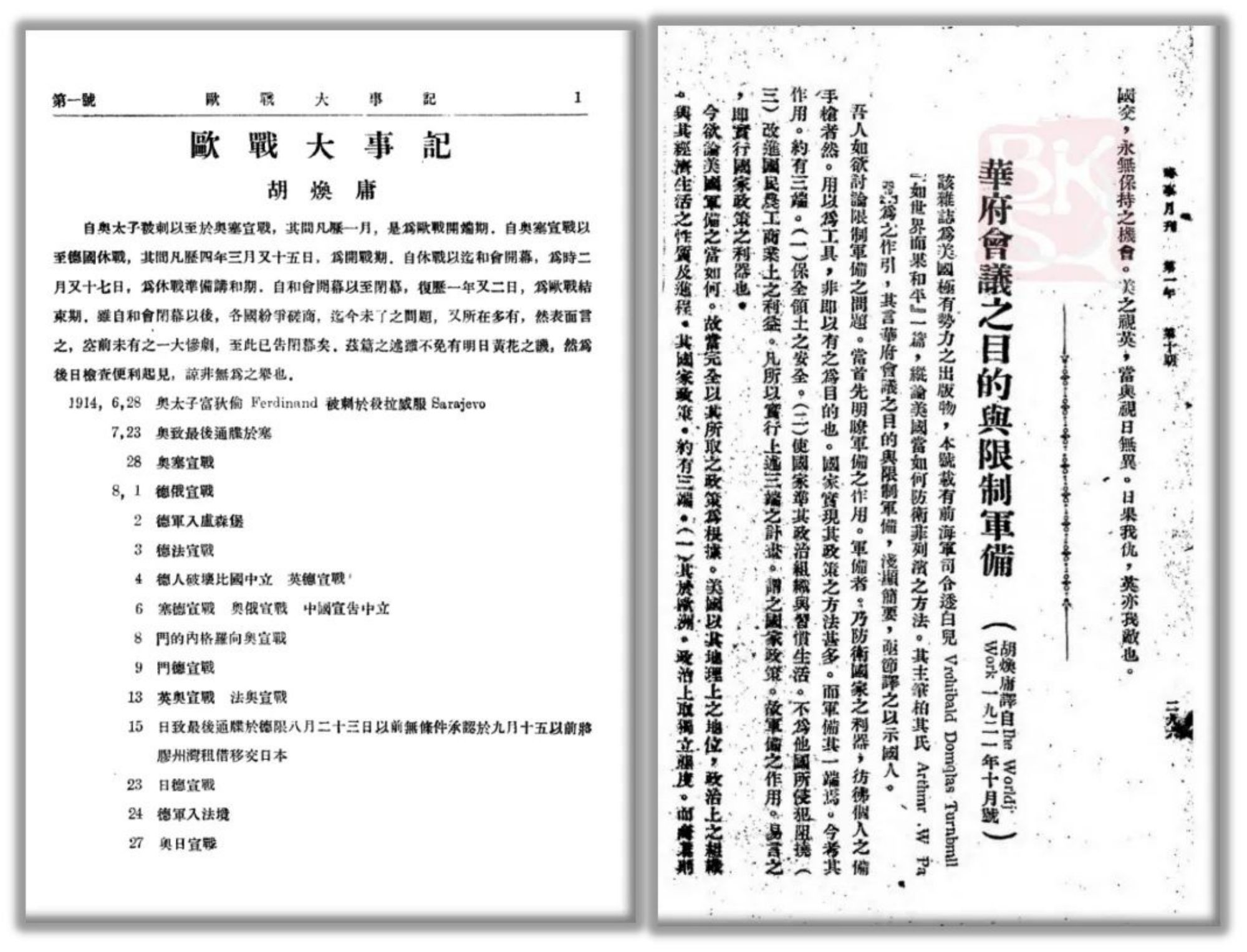 1921年,胡焕庸发表自己的首篇论文《欧战大事记》与译文《华府会议之目的与限制军备》